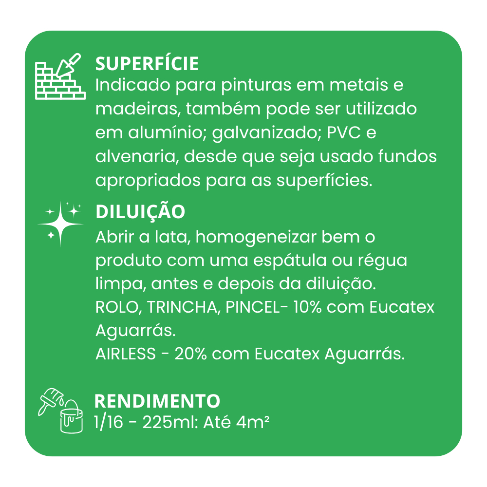 Eucalux Secagem Rápida – Esmalte Premium (Eucatex) Descrição geral O Eucalux Secagem Rápida é um esmalte premium desenvolvido pela Eucatex, projetado para aplicações decorativas em ambientes internos e externos. Sua fórmula de alta performance oferece acabamento brilhante e durável, com tempo de secagem acelerado, ideal para quem busca praticidade e qualidade nas pinturas. Destaques e benefícios Secagem rápida: permite repintura em menor intervalo de tempo, economizando etapas e facilitando o processo. Alto brilho: acabamento com brilho elegante que valoriza o ambiente. Boa resistência: protege superfícies contra desgaste, mantendo a aparência da pintura por mais tempo. Versátil: pode ser usado em portas, janelas, grades, móveis metálicos ou de madeira, entre outras superfícies apropriadas. Excelente aderência: adere bem à superfície preparada corretamente, garantindo uniformidade. Modo de uso recomendado Prepare a superfície: limpe, lixe e remova impurezas. Aplique demão de fundo adequado (se necessário), conforme orientação técnica. Misture o esmalte conforme instruções (se for à base de solvente, atente-se à diluição recomendada). Aplique uma ou mais demãos finas com pincel, rolo ou pistola, respeitando o intervalo de secagem entre demãos. Aguarde a cura total antes de submeter a pintura a uso intenso. Cores e apresentação Disponível em diversas cores da cartela da Eucatex, permitindo combinações criativas e harmoniosas. Embalagens variadas (potes menores ou maiores) para atender diferentes demandas de uso. Cuidados e recomendações Agite bem antes de usar. Use em ambiente ventilado e com proteção (luvas, máscara). Não aplique com alta umidade ou em condições extremas de temperatura. Armazene em local fresco, ao abrigo da luz solar direta e bem fechado após uso. Evite a mistura com produtos de origem desconhecida para preservar a performance.