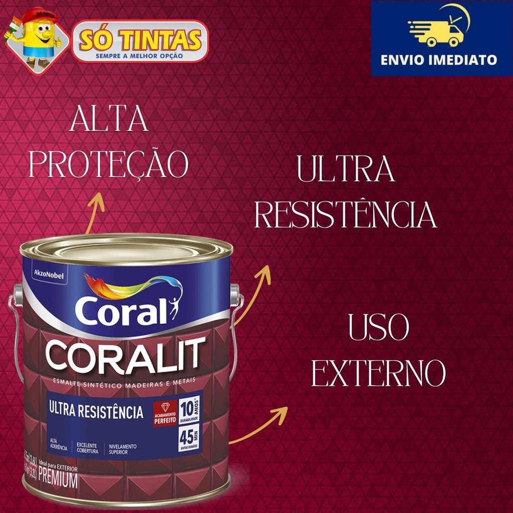 Imagine portas e janelas que não apenas protegem sua casa, mas também realçam sua beleza! Com a Tinta Esmalte Coral Coralit Ultra Resistência, você conquista um acabamento Brilhante deslumbrante que mantém sua aparência de novo por até 10 anos. Sua fórmula inovadora com silicone cria uma película brilhante, oferecendo máxima proteção contra os elementos e garantindo um lar acolhedor e estiloso. Com a Tinta Esmalte Coral Coralit Ultra Resistência, a diferença está na qualidade! A aplicação é simples e rápida. Siga estes passos: 1.Prepare a Superfície: Lixe e limpe a área para garantir a melhor aderência. 2.Diluição Perfeita: Misture conforme a aplicação: 10% para pincel/rolo ou até 30% para pistola. 3.Aplique com Confiança: Use rolo de espuma para áreas grandes ou pincel para detalhes, e veja como o acabamento é uniforme e lindo. 4.Duas Demãos: Espere a secagem entre as demãos e alcance um resultado profissional. Benefícios: •Durabilidade de 10 Anos: Invista uma vez e desfrute de um acabamento duradouro. •Acabamento Brilhante: Estilo que valoriza qualquer espaço, tanto interno quanto externo. •Fórmula com Silicone: Proteção extra contra umidade e desgaste.•Fácil Aplicação: Ideal para DIYs e profissionais, com instruções claras e simples. Dados Técnicos •Marca: Coral •Classificação: Esmalte Sintético •Modelo: Coralit Ultra Resistência •Acabamento: Brilhante •Volume: 3,6 Litros •Rendimento: Até 75 m² •Diluição: oPincel/Rolo: Máximo de 10% (5 partes de tinta para 0,5 parte de diluente Aguarrás Coral) oPistola: Máximo de 30% (5 partes de tinta para 1,5 parte de diluente Aguarrás Coral) •Demãos Recomendadas: 2 demãos •Secagem: oAo toque: 1 a 3 horas oEntre demãos: 8 horas oSecagem final: 18 horas •Validade do Produto: 36 meses •Aplicação: Indicado para uso externo em madeiras, metais, galvanizados e alumínio •Diferenciais: Fórmula com silicone que cria uma película acetinada de alta proteção, mantendo o acabamento e a aparência de novo por muito tempo Aplicação 1.Preparação da Superfície: oLixe a superfície a ser pintada para garantir uma melhor adesão da tinta. oLimpe a área com um pano limpo para remover poeira e resíduos. 2.Proteção: oUse fita adesiva para cobrir áreas que não devem ser pintadas, como maçanetas ou janelas. 3.Diluição da Tinta: oMisture bem a tinta com uma espátula antes de diluir. oDilua a tinta conforme a aplicação: ?Pincel/Rolo: Diluir no máximo 10% (5 partes de tinta para 0,5 parte de diluente). ?Pistola: Diluir no máximo 30% (5 partes de tinta para 1,5 parte de diluente). 4.Aplicação:oPara áreas grandes, use o rolo de espuma ou a pistola, aplicando a tinta de maneira uniforme. oPara áreas pequenas ou detalhes, utilize o pincel com cerdas macias. oAplique a primeira demão e deixe secar por 8 horas. 5.Segunda Demão: oApós o tempo de secagem, aplique a segunda demão da tinta. Isso garantirá um acabamento mais uniforme e durável. 6.Secagem Final: oApós a segunda demão, aguarde 18 horas para que a tinta seque completamente. Principais perguntas: Acompanha nota fiscal? Sim, todos os nossos produtos são enviados com nota fiscal. O envio é por Correios? Pode ser enviado por Correios ou por transportadora privada, isso vai depender da disponibilidade das transportadoras que atendem o seu endereço. Porque não posso comprar mais de 4 unidades no mesmo pedido? Infelizmente há uma limitação por parte das transportadoras. Elas enviam apenas 4 unidades em cada pedido devido às dimensões e peso do pacote. Para mais unidades, você vai precisar fazer mais de um pedido, respeitando o limite máximo de 4 por pedido. Só Tintas, sempre a melhor opção. Somos a maior rede de lojas de tintas no estado do Rio de Janeiro. Desde 1977, a Só Tintas atua no Rio de Janeiro oferecendo os melhores produtos e soluções em pintura imobiliária, automotiva e industrial. Somos uma empresa familiar que começou em Teresópolis e hoje temos mais de 30 lojas físicas. Trabalhamos de forma ética e transparente, com o principal objetivo de proporcionar aos nossos clientes um atendimento de excelência, provendo as melhores soluções. Nossa missão é levar cor para a vida das pessoas. Por isso a Só Tintas é Sempre a Melhor Opção
