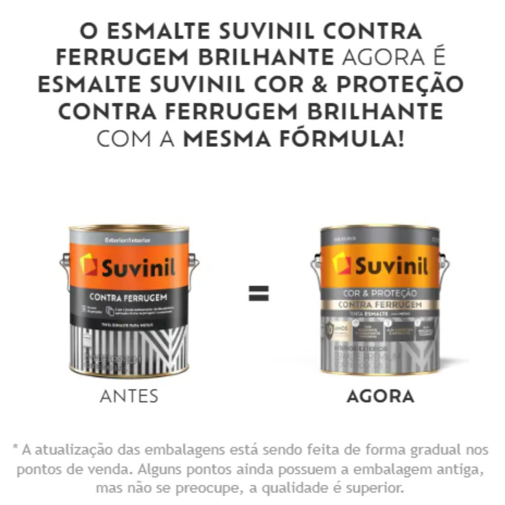 | TINTA ESMALTE SUVINIL CONTRA FERRUGEM BRILHANTE 3,6L VÁRIAS CORES este produto | R$ 264,57 | 5% | 5.0/5 | — |