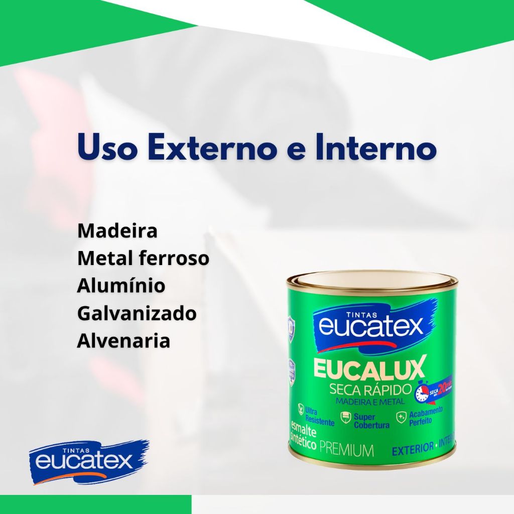 Eucalux Seca Rápido Esmalte Premium#ProdutoComNotaFiscal#EnvioImediato#EnviamosParaTodoOBrasil#RetiradaEmLoja#QualidadeGarantidaINFORMAÇÕES SOBRE O PRODUTOEucalux Seca Rápido Esmalte PremiumÉ indicado para aplicação em superfícies de madeira, metais ferrosos, alumínio, galvanizado e alvenaria. Sua fórmula inovadora permite uma secagem em até 30 minutos ao toque e ainda possui silicone que cria uma película com proteção prolongada para conservar o brilho e facilitar a limpeza.ESPECIFICAÇÕES TÉCNICAS- SUPERFÍCIEUso externo e interno.-Madeira-Metal ferroso-Alumínio-Galvanizados-AlvenariaDILUIÇÃOCom Eucatex Aguarrás:-Rolo, trincha e pincel: 10% em todas as demãos-Pistola: 20% de Eucatex AguarrásRENDIMENTO-Galão 3,6L: até 75m² por demãoDEMÃOS-2 a 3APLICAÇÃO-Rolo de espuma-Pincel-PistolaSECAGEM-Ao toque: 20 min-Entre demãos: 45 min-Final: de 5 a 8 horas.Produto classificado conforme a Norma ABNT NBR 11702, tipo 4.2.1.1 LOJAO grupo SOLUWAN atua neste mercado há mais de 30 anos, possuindo loja física e online.Com 30 anos de história procuramos atender nossos clientes com agilidade, competência, ética e honestidade.Vendemos somente produtos novos e de qualidade garantida.Despachamos em até 24 horas.Entregamos para todo o Brasil. .#tintaeucatex #pegpinte #esmaltesintético #3600ml #econômica #variascores #secagemrapida #envioimediato #qualidadegarantida #rendemais #melhorcustobeneficio #metal #madeira #secarapido #proteção #rendimento #cobertura #produtocomnotafiscal #esmaltesecarapido #esmalteeucatex #eucalux #secarapido #eucaluxbrilhante