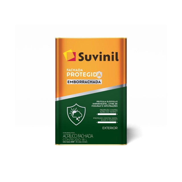 Fachada Protegida Emborrachada Transforme sua fachada com a linha Suvinil Fachada Protegida Você protege suas paredes externas contra os efeitos do sol e da chuva, mantendo cores vibrantes. A tinta que protege sua parede por 8 anos. Função Pintar e acompanhar a dilatação de até 0,3 mm, e retração de superfícies de alvenaria em geral. Indicação de Uso Especialmente indicada primeira pintura e repintura de área externa, sobre superfícies de concreto, blocode concreto, fibrocimento, texturas, reboco e sobre Suvinil Massa Acrílica. Principais Atributos Pelicula elástica e impermeável, livre de fissuras e infiltrações; Proteção contra ações do tempo; Proteção contra mofo, algas e fungos; *Imagens meramente ilustrativas *Todas as informações divulgadas são de responsabilidade do Fabricante/Fornecedor Marca: Suvinil Acabamento: Fosco Ambiente indicado: Externos Superfícies indicadas: Especialmente indicada para primeira pintura e pintura de área externa,sobre superfícies de concreto,bloco de concreto, fibrocimento, texturas, reboco e sobre Suvinil Massa Acrílica. Linha: Fachada Protegida Emborrachada Tipo de Tinta: Acrílico Premium Fachada Volume da embalagem: 18L Rendimento acabado (18L): até 85 m² Secagem ao toque: 2 horas Secagem entre demãos: 4 horas Secagem final: 12 horas É inflamável? Não Ferramenta indicada para aplicação: Rolo de lã ou trincha. Números de demãos indicadas: 3 ou mais (O número de demãos pode variar dependendo da superfície e cor escolhida) Resistência à abrasão úmida com pasta abrasiva de acordo com a ABNT NBR 14940 (lavabilidade): = 150 ciclos Poder de cobertura seca de acordo com a ABNT NBR 14942: = 4 m2/litros Poder de cobertura de tinta úmida de acordo com a ABNT NBR 14943: = 80,0 % Alongamento de acordo com ABNT NBR 16548 e ABNT NBR13321: = 100 % Resistência à tração na ruptura de acordo com a ABNT NBR 16548 e ABNT NBR13321: = 1,5 MPa Resistência ao crescimento de fungos em placa de Petri, com lixiviação de acordo com a ABNT NBR 15987: Resiste Brilho de acordo com a ABNT NBR 15299: = 8 UB Diluição: 10% de água potável Prazo de Validade (embalagem fechada e sem uso): 36 Meses Tintas para ambientes externos. 01 Tinta Fachada Protegida Emborrachada Branco Neve 18L Suvinil