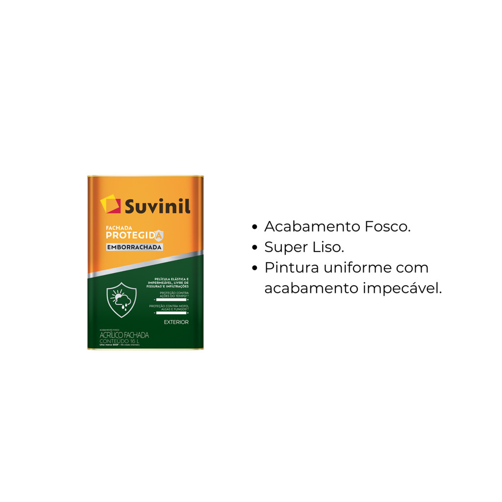 Fachada Protegida Emborrachada Transforme sua fachada com a linha Suvinil Fachada Protegida Você protege suas paredes externas contra os efeitos do sol e da chuva, mantendo cores vibrantes. A tinta que protege sua parede por 8 anos. Função Pintar e acompanhar a dilatação de até 0,3 mm, e retração de superfícies de alvenaria em geral. Indicação de Uso Especialmente indicada primeira pintura e repintura de área externa, sobre superfícies de concreto, blocode concreto, fibrocimento, texturas, reboco e sobre Suvinil Massa Acrílica. Principais Atributos Pelicula elástica e impermeável, livre de fissuras e infiltrações; Proteção contra ações do tempo; Proteção contra mofo, algas e fungos; *Imagens meramente ilustrativas *Todas as informações divulgadas são de responsabilidade do Fabricante/Fornecedor Marca: Suvinil Acabamento: Fosco Ambiente indicado: Externos Superfícies indicadas: Especialmente indicada para primeira pintura e pintura de área externa,sobre superfícies de concreto,bloco de concreto, fibrocimento, texturas, reboco e sobre Suvinil Massa Acrílica. Linha: Fachada Protegida Emborrachada Tipo de Tinta: Acrílico Premium Fachada Volume da embalagem: 16L Rendimento acabado (16L): até 76m² Secagem ao toque: 2 horas Secagem entre demãos: 4 horas Secagem final: 12 horas É inflamável? Não Ferramenta indicada para aplicação: Rolo de lã ou trincha. Números de demãos indicadas: 3 ou mais (O número de demãos pode variar dependendo da superfície e cor escolhida) Resistência à abrasão úmida com pasta abrasiva de acordo com a ABNT NBR 14940 (lavabilidade): = 150 ciclos Poder de cobertura seca de acordo com a ABNT NBR 14942: = 4 m2/litros Poder de cobertura de tinta úmida de acordo com a ABNT NBR 14943: = 80,0 % Alongamento de acordo com ABNT NBR 16548 e ABNT NBR13321: = 100 % Resistência à tração na ruptura de acordo com a ABNT NBR 16548 e ABNT NBR13321: = 1,5 MPa Resistência ao crescimento de fungos em placa de Petri, com lixiviação de acordo com a ABNT NBR 15987: Resiste Brilho de acordo com a ABNT NBR 15299: = 8 UB Diluição: 10% de água potável Prazo de Validade (embalagem fechada e sem uso): 36 Meses Tintas para ambientes externos. 01 Tinta Fachada Protegida Emborrachada 16L Suvinil
