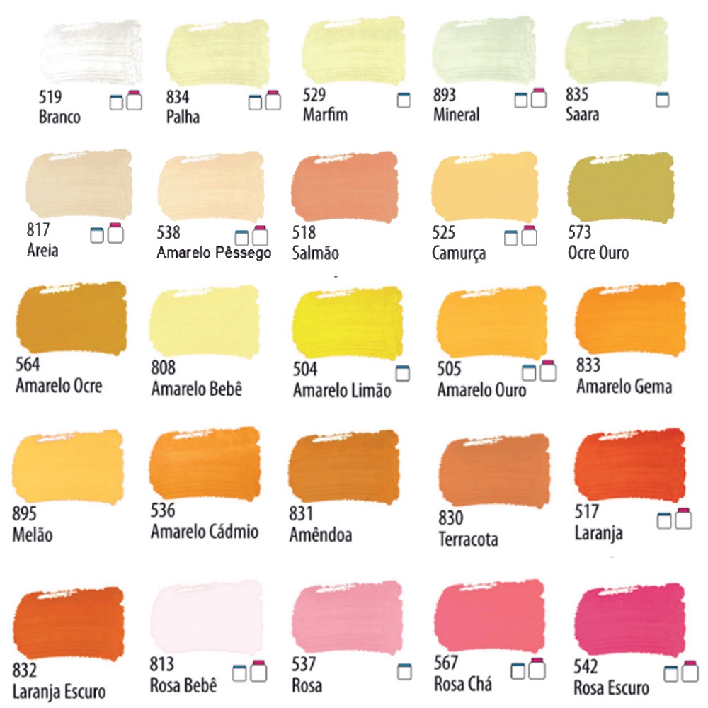 - KIT COM 6 POTES DE TINTA PVA FOSCA PARA ARTESANATO 37 ML - APÓS A COMPRA, ENVIE O CÓDIGO DAS CORES DESEJADAS PELO CHAT. ENVIE UMA MENSAGEM EM ATÉ 1H APÓS A COMPRA. SE AS CORES NÃO FOREM SELECIONADAS, VAMOS ENVIAR CORES ALEATÓRIAS. - Ideal para trabalhos artesanais sobre madeira gesso MDF cerâmica cortiça isopor papel, palha e PET (preparado antes com Primer Acrilex) - Pode ser aplicada com pincel esponja ou rolinho de espuma. - CARACTERÍSTICAS . A base de Látex P.V.A . Secagem rápida . Acabamento fosco . Pronta para uso - AUXILIARES . Diluente: água . Gel para Matizar, Médium Acrílico, Verniz Acrílico, Lacas, Acrilfix e Base Acrílica para Artesanato. - Cores do catálogo da PVA: 501 AZUL TURQUESA 503 AZUL CELESTE 504 AMARELO LIMAO 505 AMARELO OURO 506 CERAMICA 507 VERMELHO FOGO 508 VERMELHO ESCARLATE 510 VERDE FOLHA 511 VERDE BANDEIRA 513 VERDE MUSGO 515 CERÂMICA CLARA 516 VIOLETA 517 LARANJA 518 SALMÃO 519 BRANCO 520 PRETO 525 CAMURÇA 526 MARROM ESCURO 528 LILÁS 529 MARFIM 531 MARROM 535 AZUL MAR 536 AMARELO CADMIO 537 ROSA 538 AMARELO PELE 541 VERMELHO VIVO 542 ROSA ESCURO 543 AZUL ULTRAMAR 545 VERDE OLIVA 549 MAGENTA 551 SÉPIA 558 VERDE VIVO 564 AMARELO OCRE 565 VINHO 567 ROSA CHÁ 568 AZUL CERÚLEO 570 VERDE PISTACHE 571 VERDE ESMERALDA 573 OCRE OURO 574 CINZA LUNAR 577 TURQUESA 579 AZUL HORTÊNSIA 581 ROSA CICLAME 584 AZUL INVERNO 585 CAPUCCINO 587 LAVANDA 595 BORDEAUX 596 AZUL PETRÓLEO 802 VERDE MAÇÃ 805 GOIABA QUEIMADA 808 AMARELO BEBÊ 809 LILÁS BEBÊ 813 ROSA BEBÊ 814 CHOCOLATE 815 CASTANHO CLARO 817 AREIA 818 CAMURÇA QUEIMADO 819 CONCRETO 820 VERDE PRIMAVERA 821 VERDE ÁGUA 822 VERDE COUNTRY 823 AZUL PISCINA 824 AZUL SECO 825 AZUL COUNTRY 826 CEREJA 827 ROMÃ 828 ROSA ANTIGO 829 FLAMINGO 830 TERRACOTA 831 AMENDOA 832 LARANJA ESCURO 833 AMARELO GEMA 834 PALHA 835 SAARA 893 MINERAL 895 MELÃO 896 RÚSTICO 898 VERDE ALECRIM 914 ARÁNDANO 915 ORQUÍDEA - Fabricante: Acrilex