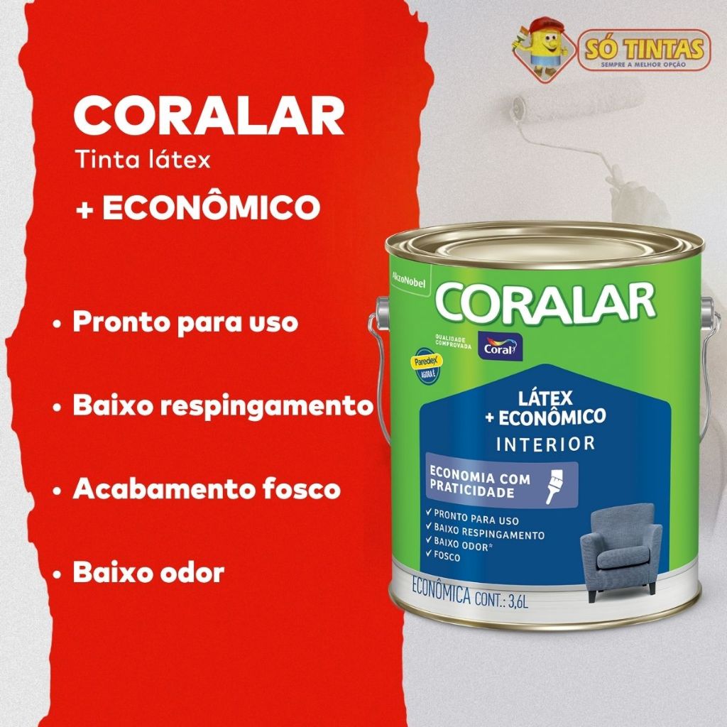 Tinta Acrílica Coralar Látex Econômico Interior – 3,6L A Tinta Látex Econômico Coralar Interior 3,6L, da Coral, é ideal para quem busca qualidade, economia e praticidade na pintura de ambientes internos. Com baixo odor, fácil aplicação e secagem rápida, oferece acabamento fosco uniforme, disfarçando pequenas imperfeições e proporcionando paredes lisas, com ótimo rendimento e ação antimofo. Perfeita para paredes de quartos, salas, corredores e áreas internas em geral, a Coralar alia economia com excelente cobertura, garantindo resultados de alto padrão com o melhor custo-benefício. Especificações Técnicas Produto: Coralar Látex Econômico Interior Marca: Coral Volume: 3,6 Litros Uso: Ambientes internos Acabamento: Fosco Características: pronto para uso, baixo odor, baixo respingamento, fácil aplicação, secagem rápida e ação antimofo Diluição: até 20% com água limpa em todas as demãos Rendimento: até 18 m²/demão (pode variar conforme a superfície e diluição) Demãos: 2 a 3 demãos | intervalo: 4 horas Secagem: toque 2h | entre demãos 4h | final 12h Aplicação: rolo de lã de pelo baixo, pincel ou trincha Odor: Suave Cor: Branco e tons disponíveis na linha Coral Por que escolher Coralar? ✔ Economia com qualidade Coral ✔ Boa cobertura e rendimento ✔ Secagem rápida e baixo odor ✔ Acabamento fosco que disfarça imperfeições ✔ Ação antimofo que prolonga a durabilidade da pintura ✔ Aplicação fácil e sem respingos Onde usar Paredes internas de salas e quartos Superfícies de alvenaria, reboco e concreto Gesso, blocos de cimento e cerâmica não vitrificada Dicas de Aplicação 1️⃣ Certifique-se de que a superfície esteja firme, limpa e seca. 2️⃣ Lixe entre as demãos se necessário para melhor uniformidade. 3️⃣ Utilize rolo de lã de pelo baixo, pincel ou trincha. 4️⃣ Dilua apenas quando necessário com água limpa (até 20%). 5️⃣ Evite pintar em dias chuvosos ou com umidade acima de 85%. 6️⃣ Limpe as ferramentas com água e sabão neutro logo após o uso. Perguntas Frequentes Acompanha nota fiscal? ✔ Sim, todos os produtos são enviados com nota fiscal. Posso comprar mais de 1 unidade no mesmo pedido? 🚚 Para embalagens de 3,6L, é permitido comprar até 4 unidades por pedido, devido às limitações de transporte. Para adquirir mais, é necessário realizar novos pedidos. O envio é por Correios? ✔ O envio é realizado pela transportadora da Shopee, garantindo segurança e agilidade na entrega. 👉 Garanta já a sua Tinta Acrílica Coralar Látex Econômico Interior 3,6L e conquiste paredes perfeitas, acabamento fosco e secagem rápida, com a qualidade e confiança Coral. (Tinta, Látex, Coralar, Econômica, 3,6L, Coral, Parede, Sala, Quarto, Secagem Rápida, Baixo Odor, Interior, Ação Antimofo) 🏆 Só Tintas, sempre a melhor opção! Somos a maior rede de lojas de tintas do estado do Rio de Janeiro. Desde 1977, oferecemos os melhores produtos e soluções em pintura imobiliária, automotiva e industrial. São mais de 30 lojas físicas, sempre com atendimento de excelência e transparência. Nossa missão é simples: levar cor para a vida das pessoas!