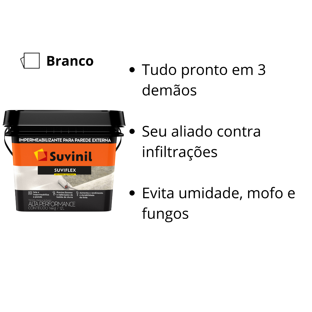 Suviflex protege as paredes porque é um fundo impermeabilizante que forma uma camada flexível e elástica, prevenindo que as fissuras reapareçam. Além disso, Suviflex tem uma boa cobertura e durabilidade com apenas duas demãos, você já pode aplicar sua tinta Suvinil favorita! Marca: Suvinil. Cor: Branco. Embalagem: Balde 12 Litros. Secagem ao toque: 2 horas. Secagem entre demãos: 4 horas. Secagem final: 24 horas. Quantidade necessária de demãos: 1 a 2. Rendimento por demão: até 165 m². Diluição: Primeira pintura ou repintura, concreto, blocos de concreto, placa cimentícia ou reboco: dilua com 10% de àgua potável. Para aplicação com airless dilua com até 10% de água potável por litro e aplique com pressão entre 1400 e 1600 psi. Use bico com abertura de 0,021” e a velocidade de aplicação entre 7 e 9 m2/min. Indicado: Indicado para impermeabilização de paredes expostas a chuva, superfícies de concreto e fibrocimento, restauração de fachadas e paredes pintadas com PVA ou Acrílico. Tinta Manta Liquid. p/ Parede Suviflex 14kg/12L Suvinil
