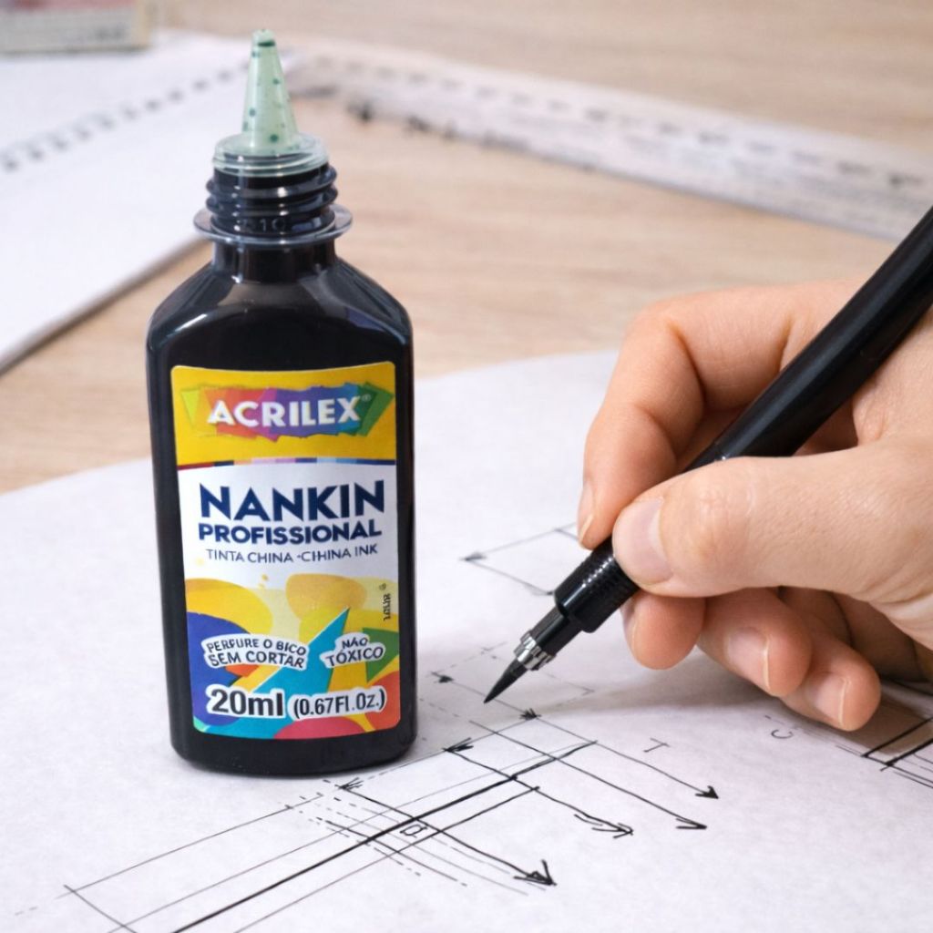 A Tinta Nankin Acrilex Profissional é uma tinta de alta qualidade, desenvolvida para artistas, ilustradores, designers, estudantes e profissionais que buscam traços precisos, intensos e duráveis. Possui excelente fluidez, secagem rápida e acabamento uniforme, sendo ideal para trabalhos artísticos, técnicos e artesanais. É uma tinta não tóxica, segura para uso artístico e escolar, com bico aplicador que perfura sem cortar, facilitando o controle da aplicação. Para que serve Indicada para: Ilustração artística Desenho técnico e arquitetônico Caligrafia e lettering HQs, mangás e esboços Artesanato e projetos criativos Trabalhos escolares e acadêmicos Aplicações – Onde pode ser usada Pode ser utilizada em: Papel Cartolina Poliéster Gesso Madeira (com primer) Cerâmica Vidro PET (com primer) Como utilizar Agite levemente antes do uso Utilize com: Caneta técnica Pena de caligrafia Bico aplicador Pincel fino Aplique diretamente sobre a superfície desejada Aguarde a secagem completa antes de manusear Em superfícies lisas como vidro, cerâmica, madeira e PET, recomenda-se o uso de primer para melhor fixação. Características Tinta Nankin (China Ink) Uso profissional e artístico Cor intensa e uniforme Secagem rápida Excelente rendimento Não tóxica Bico aplicador que perfura sem cortar Fácil de aplicar Marca: Acrilex Conteúdo e Opções de Compra Conteúdo de cada frasco: 20 ml (0,67 fl. oz.) Embalagem: frasco plástico com bico aplicador Cor: preta Produto novo e original Venda em kits de 1, 2, 3, 4 ou 5 unidades O cliente pode escolher a quantidade desejada no momento da compra, conforme as opções disponíveis no anúncio