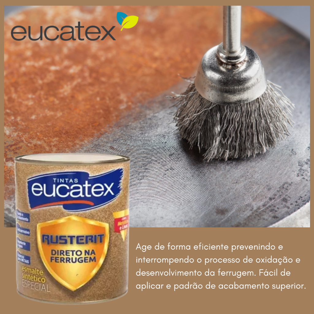 TINTAS EUCATEX RUSTERIT DIRETO NA FERRUGEM 900ml (Veja as cores disponíveis no campo da compra) #ProdutoComNotaFiscal #EnvioImediato #EnviamosParaTodoOBrasil #RetiradaEmLoja #QualidadeGarantida ..................................................................................................................................... INFORMAÇÕES SOBRE O PRODUTO ..................................................................................................................................... EUCATEX RUSTERIT DIRETO NA FERRUGEM É um produto desenvolvido com a mais alta tecnologia, formulado para aplicação diretamente sobre superfícies metálicas enferrujadas e limpas, com sua fórmula inovadora dispensa o uso prévio de fundo anticorrosivo. Age de forma eficiente prevenindo e interrompendo o processo de oxidação e desenvolvimento da ferrugem. Fácil de aplicar e padrão de acabamento superior. ..................................................................................................................................... ESPECIFICAÇÕES TÉCNICAS ..................................................................................................................................... - SUPERFÍCIE Metálicas - DILUIÇÃO Com Eucatex Aguarrás: Rolo, trincha e pincel: 10% em todas as demãos Pistola: 20% de Eucatex Aguarrás - RENDIMENTO Galão 0,900ml: até 9m² por demão Galão 3,6L: até 36m² por demão - DEMÃOS Duas a três - APLICAÇÃO Rolo de espuma Pincel Trincha Pistola - SECAGEM Ao toque: 2 horas Entre demãos: 8 horas Final: 18 horas As cores podem sofrer variações de acordo com o tipo, configuração e resolução do seu aparelho. Considere apenas como uma referência. Para uma visualização mais precisa, consulte o catálogo do produto disponível em lojas e, sempre que possível, faça um teste no local a ser pintado utilizando uma pequena quantidade de tinta na cor escolhida. ..................................................................................................................................... PRODUTO DE ACORDO COM A NORMA ABNT NBR 13.2145 ..................................................................................................................................... ..................................................................................................................................... LOJA ..................................................................................................................................... O grupo SOLUWAN atua neste mercado há mais de 30 anos, possuindo loja física e online. Com 30 anos de história procuramos atender nossos clientes com agilidade, competência, ética e honestidade. Vendemos somente produtos novos e de qualidade garantida. Despachamos em até 24 horas. Entregamos para todo o Brasil. ..................................................................................................................................... DÚVIDAS FREQUENTES ..................................................................................................................................... Pergunta: Como é embalado o produto? Resposta: Todos os nossos produtos vendidos são embalados em caixas lacradas ou plástico stretch. Em respeito ao meio ambiente 90% das caixas são reutilizadas. Pergunta: Quem faz a entrega? Resposta: A entrega é terceirizada, feita via CORREIOS ou TRANSPORTADORA. Pergunta: Posso retirar meu pedido em loja? Resposta: Nós do grupo Soluwan disponibilizamos a opção de retirada em Loja, hoje sendo uma das poucas empresas na plataforma à disponibilizar está opção. Pergunta: O envio é feito em quantos dias? Resposta: Nós enviamos o seu pedido no prazo máximo de 24 horas após a confirmação de sua compra, sendo um dos envios mais rápidos da plataforma. Pergunta: Os produtos são novos ou usados? Resposta: Todos os produtos que trabalhamos são novos e com qualidade garantida. #tintaeucatex #rusterit #ferrugem #galao #900ml #econômica #variascores #secagemrapida #envioimediato #qualidadegarantida #rendemais #melhorcustobeneficio #tintaferrugem #tintaparaferrugem #produtocomnotafiscal