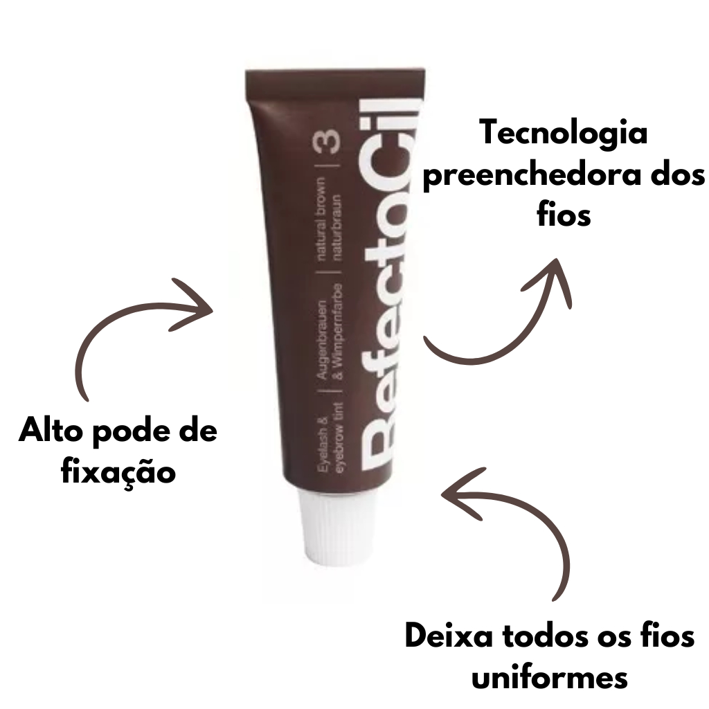 Refectocil Castanho natural ========================= Pode ser usada tanto para as mulheres colorirem as sobrancelhas, como para os homens colorirem a barba e as costeletas; Fácil aplicação: com a tinta e o Oxidant 3% RefectoCil, o processo é prático e pode ser feito em casa; Sua fórmula age rápido, sendo necessário de 10 a 20 minutos para estar pronto.