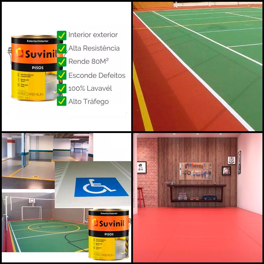 É indicado para áreas de lazer, escadas, varandas, quadras poliesportivas e outras superfícies de concreto rústico, liso ou ainda para repintura. . Suvinil Pisos resiste ao atrito de circulação de pessoas e carros nos mais diferentes tipos de pisos, como garagens, quadras, calçadas, áreas de lazer, escadas, concreto, pisos cimentados e cerâmicos. Seu rendimento é de até 120m2 acabados. Além de possuir alta cobertura, essa tinta ainda possui uma tecnologia de alta durabilidade. .