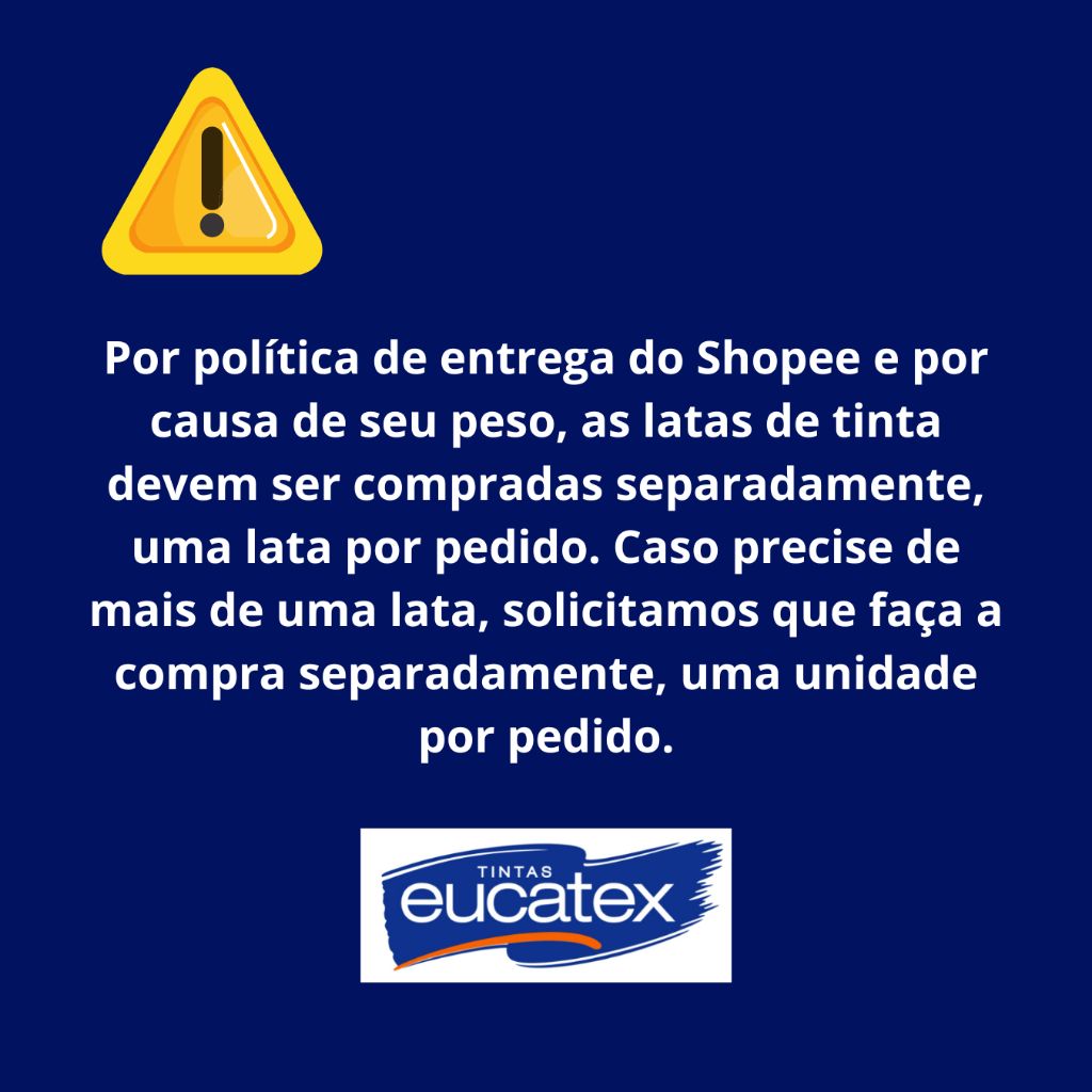 Tinta Piso Eucatex Grafeno Muito Mais Resistente 18l - Cores.....................................................................................................................................DESCRIÇÃO DO PRODUTOEucatex Ultra Piso Grafeno é uma ultra tinta acrílica para pisos cimentados, aditivada com nova tecnologia grafeno. a nanotecnologia grafeno atribui ao produto maior resistência, alta aderência, super durabilidade, possuindo ainda acabamento semiacetinado que reduz a pega de sujeira.Galão 900ml: Branco até 4m² por embalagem/ pintura acabada - Cores até 6m² por embalagem / pintura acabada.Galão 3,6L: Branco até 28m² por embalagem / pintura acabada - Cores até 24m² por embalagem / pintura acabada.Lata 18L: Branco até 70m² por embalagem / pintura acabada - Cores até 120m² por embalagem / pintura acabada......................................................................................................................................INFORMAÇÕES DO PRODUTO.....................................................................................................................................SUPERFÍCIEPisos cimentadosQuadras poliesportivasDemarcação de garagensEstacionamentosDILUIÇÃOCom água: 30% na primeira demão e 20% na demais demãos.AIRLESS - 40% em todas as demãos......................................................................................................................................RENDIMENTOGalão 900ml: Branco até 4m² por embalagem/ pintura acabada - Cores até 6m² por embalagem / pintura acabada.Galão 3,6L: Branco até 28m² por embalagem / pintura acabada - Cores até 24m² por embalagem / pintura acabada.Lata 18L: Branco até 70m² por embalagem / pintura acabada - Cores até 120m² por embalagem / pintura acabada......................................................................................................................................Embalagem EMBALAGEMQuarto (900ml)Galão (3,6L)Lata (18L).....................................................................................................................................DEMÃOS2 a 3 demãos dependendo da absorção da superfície......................................................................................................................................SECAGEMAo toque: 1 horaEntre demãos: 4 horasFinal: 12 horasFinal: tráfego de pessoas 48 horasFinal: tráfego de veículos 72 horas.....................................................................................................................................APLICAÇÃORolo de lã de pelo baixoPincel Trincha Airless.....................................................................................................................................ACABAMENTOS - Semiacetinado....................................................................................................................................MATERIAIS DE APLICAÇÃO -Rolo de lã de pelo baixo, pistola, pincel ou trincha.....................................................................................................................................-Rendimento 3 m²/Kg-Secagem ao toque-Ao toque: 30min-Entre demãos: 3h-Final: 5h-Número de demãos 2.....................................................................................................................................CARACTERÍSTICAS DO PRODUTO-Alto poder de enchimento-Alta resistência e poder de preenchimento As cores podem sofrer variações de acordo com o tipo, configuração e resolução do seu aparelho. Considere apenas como uma referência. Para uma visualização mais precisa, consulte o catálogo do produto disponível em lojas e, sempre que possível, faça um teste no local a ser pintado utilizando uma pequena quantidade de tinta na cor escolhida. ..................................................................................................................................LOJA..................................................................................................................................O grupo SOLUWAN atua neste mercado há mais de 30 anos, possuindo loja física e on-line.Com 30 anos de história procuramos atender nossos clientes com agilidade, competência, ética e honestidade.Vendemos somente produtos novos e de qualidade garantida.Despachamos em até 24 horas.Entregamos para todo o Brasil...................................................................................................................................DÚVIDAS FREQUENTES..................................................................................................................................Pergunta: Como é embalado o produto?Resposta: Todos os nossos produtos vendidos são embalados em caixas lacradas ou plástico stretch. Em respeito ao meio ambiente 90% das caixas são reutilizadas.Pergunta: Quem faz a entrega?Resposta: A entrega é terceirizada, feita via CORREIOS ou TRANSPORTADORA.Pergunta: O envio é feito em quantos dias?Resposta: Nós enviamos o seu pedido no prazo máximo