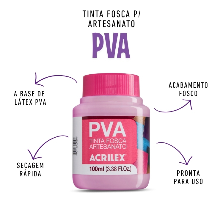 Tinta Pva P/ Artesanato 100ml ACRILEX Características: A base de Látex P.V.A. Secagem rápida. Acabamento fosco. Pronta para uso. Modo de Usar: Pode ser aplicada com pincel, esponja ou rolinho de espuma. Auxiliares: Diluente: água. Gel para Matizar, Médium Acrílico, Verniz Acrílico, Lacas, Acrilfix e Base Acrílica para Artesanato. Uso Específico: Ideal para trabalhos artesanais sobre madeira, gesso, MDF, cerâmica, cortiça, isopor, papel, palha e PET (preparado antes com Primer Acrilex).