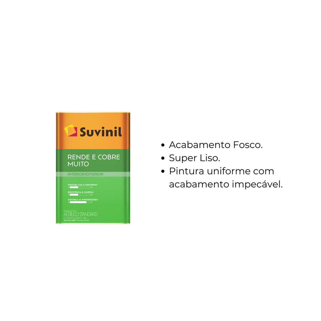 Suvinil Rende & Cobre Muito é a tinta que rende mais. O produto possui baixo odor, uma ótima cobertura e um excelente rendimento e ainda é fácil de espalhar. A Rende & Cobre Muito tem uma ótima consistência, o que facilita a aplicação após a sua diluição.Marca: SuvinilAcabamento: FoscoAmbiente indicado: Internos e ExternosSuperfícies indicadas: pinturas de superfícies de ambientes externos e internos de reboco, massa acrílica, massa corrida, texturas, concreto, fibrocimento e gesso.Linha: Rende & Cobre MuitoTipo de Tinta: Acrílico StandardVolume da embalagem: 16LRendimento acabado (16L): até 150 m²Secagem ao toque: 2 horasSecagem entre demãos: 4 horasSecagem final: 12 horasÉ inflamável? NãoFerramenta indicada para aplicação: Rolo de lã ou trincha.Números de demãos indicadas: 2 a 3 (O número de demãos pode variar dependendo da superfície e cor escolhida)Resistência à abrasão úmida com pasta abrasiva de acordo com a ABNT NBR 14940 (lavabilidade): = 40 ciclosPoder de cobertura seca de acordo com a ABNT NBR 14942: = 9 m2/litrosPoder de cobertura de tinta úmida de acordo com a ABNT NBR 14943: = 85,0 %Resistência ao crescimento de fungos em placa de Petri, com lixiviação de acordo com a ABNT NBR 15987: ResisteBrilho de acordo com a ABNT NBR 15299: = 8 UBPrazo de Validade (embalagem fechada e sem uso): 36 MesesTintas para paredes em ambientes internos e externos.01 Tinta Rende & Cobre Muito 16L Suvinil