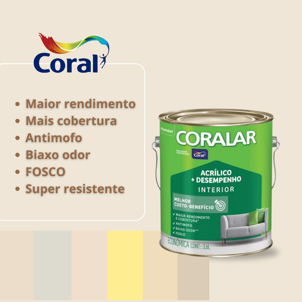 TINTA ACRILICA CORALAR 3,6LT .....................................................................................................................................INFORMAÇÕES SOBRE O PRODUTO.....................................................................................................................................CORALAR ACRÍLICO +DESEMPENHO é a tintaeconômica que proporcionao melhor custo-benefício,pois possui maior rendimentoe cobertura, além de serantimofo e possuir baixo odor. Rende até 18 m² acabados por embalagem de 3,6L.....................................................................................................................................ESPECIFICAÇÕES DO PRODUTO.....................................................................................................................................Acabamento: FOSCOSecagem: Ao toque- 30min Entre demãos- 4h Final- 4hNúmero de demãos: 3-Características do produto.Antimofo.Economia com qualidade.Boa resistência..................................................................................................................................... As cores podem sofrer variações de acordo com o tipo, configuração e resolução do seu aparelho. Considere apenas como uma referência. Para uma visualização mais precisa, consulte o catálogo do produto disponível em lojas e, sempre que possível, faça um teste no local a ser pintado utilizando uma pequena quantidade de tinta na cor escolhida. LOJA.....................................................................................................................................O grupo SOLUWAN atua neste mercado há mais de 30 anos, possuindo loja física e online.Com 30 anos de história procuramos atender nossos clientes com agilidade, competência, ética e honestidade.Vendemos somente produtos novos e de qualidade garantida.Despachamos em até 24 horas.Entregamos para todo o Brasil......................................................................................................................................DÚVIDAS FREQUENTES.....................................................................................................................................Pergunta: Como é embalado o produto?Resposta: Todos os nossos produtos vendidos são embalados em caixas lacradas ou plástico stretch. Em respeito ao meio ambiente 90% das caixas são reutilizadas.Pergunta: Quem faz a entrega?Resposta: A entrega é terceirizada, feita via CORREIOS ou TRANSPORTADORA.Pergunta: O envio é feito em quantos dias?Resposta: Nós enviamos o seu pedido no prazo máximo de 24 horas após a confirmação de sua compra, sendo um dos envios mais rápidos da plataforma.Pergunta: Os produtos são novos ou usados?Resposta: Todos os produtos que trabalhamos são novos e com qualidade garantida......................................................................................................................................#tintacoral18l #tintaantimofo #tintarosaparede #tintadeparede #tintasdeparede #tinta #tintaalgodãoegípcio #tintaparapiso #tintaparaparede #tintaacrilicabranca #tintascoral #tintasuviniltoquedeseda #tintaacrilica #tintabranca #tintacoralrendemuito #tintacimentoqueimado #tintapalha #tintaverde #tintaantimofo #latadetinta18litros #tintamarrom #tintabranconeve #tintalatex #tintacoralbranca #tintacinza #tintacinzaparede #tintaconcreto #tintaparaparedeexterna #tintaparamdf #tintabrancaparaparede #seladordeparede #tintaamarela #tintapva #tintasemibrilho #latadetintabranca #tintacromio #tintaeucatex #cimentoqueimadomaza #tintarosa #tintasherwinwilliams #tintalatexbranca #tintabrancogelo #latadetinta #maza #tintaacrilicapara tela