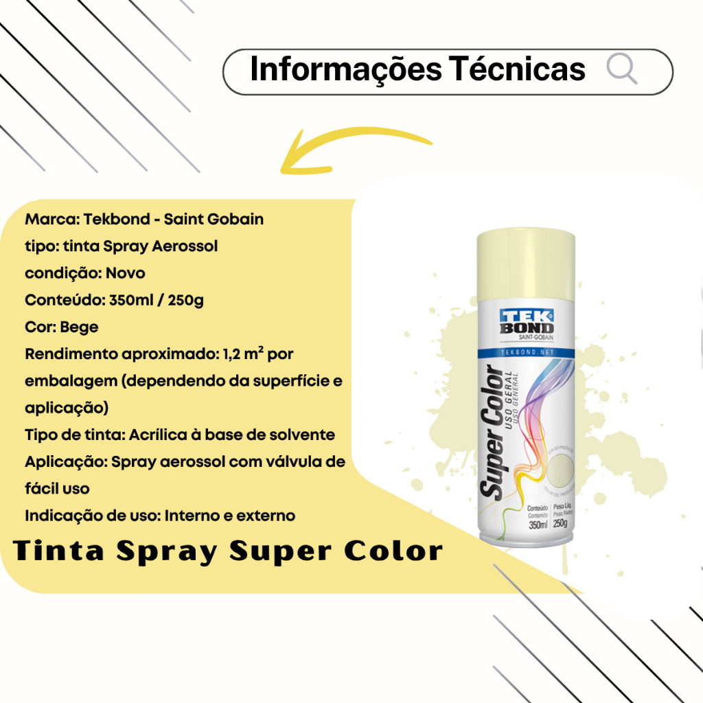 ✅ TINTA SPRAY AEROSSOL BEGE – USO GERAL – 350ml / 250g | TEKBOND 📦 CONTEÚDO DA EMBALAGEM 01x Tinta Spray Aerossol Bege – Tekbond 🔢 Referências compatíveis: 23502 | 69957327143 | 23161006900 🏷️ INFORMAÇÕES DO PRODUTO 🏭 Marca: Tekbond – Saint Gobain 🖌️ Tipo: Tinta Spray Aerossol 🆕 Condição: Produto novo ⚖️ Volume / Peso: 350ml / 250g 🎨 Cor: Bege 📐 Rendimento médio: 1,2 m² por embalagem* 💧 Base: Acrílica à base de solvente 📌 Aplicação: Spray com válvula anatômica de fácil uso 🏠🏗️ Indicação de uso: Interno e externo 🛡️ Garantia: 90 dias *Pode variar conforme superfície e aplicação. 💡 CARACTERÍSTICAS E BENEFÍCIOS ✔️ Secagem rápida com excelente acabamento ✔️ Alta cobertura, durabilidade e resistência climática ✔️ Ideal para uso interno e externo ✔️ Aplicável em ferro, aço, madeira, cerâmica, gesso, entre outros ✔️ Válvula anatômica e aplicação prática ✔️ Perfeita para soltar sua criatividade! 🧰 APLICAÇÕES RECOMENDADAS 🔩 Metais: grades, portões, ferramentas, bicicletas, eletrodomésticos 🪵 Madeira: móveis, caixas, molduras, pallets, artesanato 🧴 Plásticos rígidos: peças automotivas, capacetes, organizadores (⚠️ fazer teste de aderência) 🏺 Cerâmica e vidro (uso decorativo): garrafas, potes, vasos 📦 Papelão e papel grosso: maquetes, mockups, projetos escolares 🎯 Superfícies já pintadas: ideal para retoques e restaurações 🛠️ MODO DE USO 🧼 Limpe a superfície: remova tintas antigas, ferrugem e impurezas 🛡️ Proteja as áreas que não serão pintadas 🧴 Em metais, aplique o Primer Tekbond e lixe com lixa d’água 400 🔄 Agite bem a lata antes do uso e entre demãos Se entupir, limpe o bico com thinner ou acetona Utilize agulha fina, se necessário 🎨 Aplique 2 a 3 camadas, começando com uma demão fina ⏱️ Espere 4 a 9 minutos entre cada demão ✋ Secagem ao toque: 30 minutos 🤲 Manuseio: após 3 horas ⏳ Cura total: 24 horas | ⚙️ Testes mecânicos: após 72 horas 🛒 ONDE COMPRAR 📍 Disponível nas Lojas Oficiais: 🛠️ Camillo Parts 🚗 Genuine Automotive 📦 Edumac Parts 🧾 Produto com nota fiscal, envio rápido e suporte garantido 🛍️ Use o carrinho unificado e economize no frete! 🗄️ ARMAZENAMENTO RECOMENDADO Armazene em local seco, fresco e arejado 🌡️ Evite exposição direta ao sol ou temperaturas acima de 50°C ⚖️ AVISO LEGAL – DIREITOS AUTORAIS 🚫 É proibido o uso, cópia ou alteração das imagens e textos aqui apresentados. 📜 Todo conteúdo protegido pela Lei 9.610/98 – Direitos Autorais