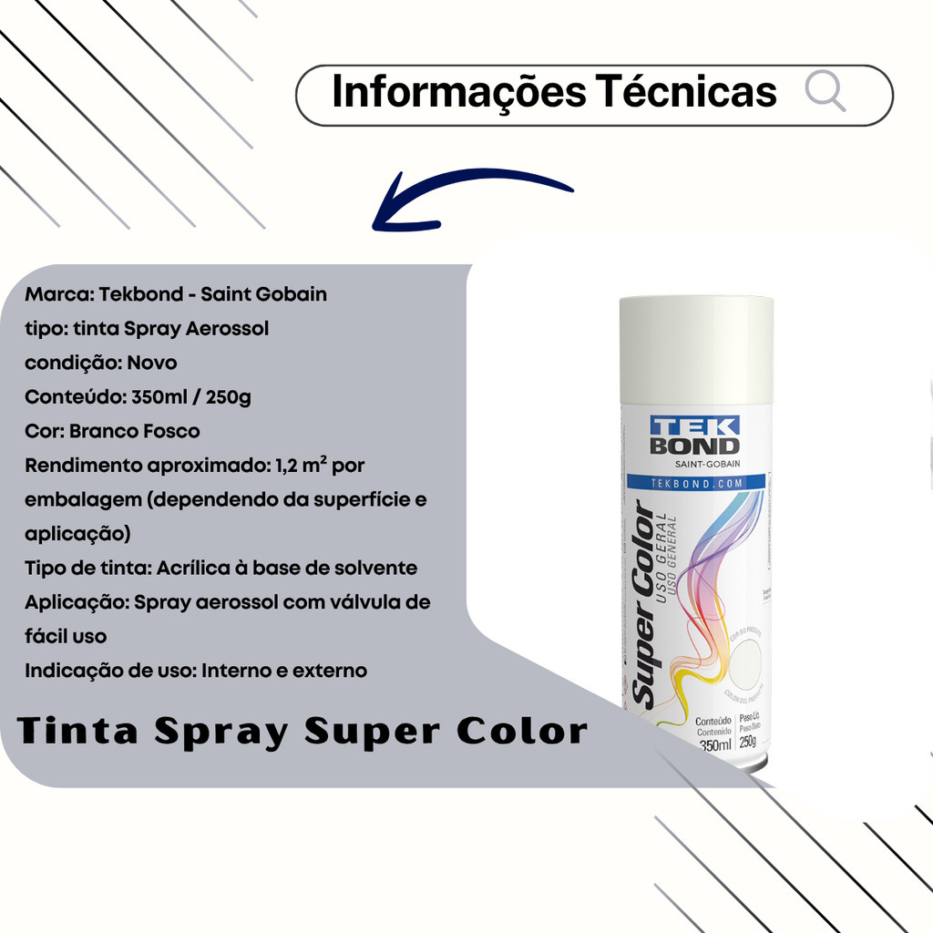 ⚪ TINTA SPRAY AEROSSOL BRANCO FOSCO – USO GERAL – 350ml / 250g | TEKBOND 📦 CONTEÚDO DA EMBALAGEM 01x Tinta Spray Aerossol Branco Fosco – Tekbond 🔢 Referências compatíveis: 23490 | 69957327126 | 23101006900 🏷️ INFORMAÇÕES DO PRODUTO 🏭 Marca: Tekbond – Saint Gobain 🖌️ Tipo: Tinta Spray Aerossol 🆕 Condição: Produto novo ⚖️ Volume / Peso: 350ml / 250g 🎨 Cor: Branco Fosco 📐 Rendimento médio: 1,2 m² por embalagem* 💧 Base: Acrílica à base de solvente 📌 Aplicação: Spray com válvula anatômica de fácil uso 🏠🏗️ Indicação de uso: Interno e externo 🛡️ Garantia: 90 dias *Rendimento pode variar conforme a superfície e o modo de aplicação. 💡 CARACTERÍSTICAS E BENEFÍCIOS ✔️ Secagem rápida com acabamento profissional ✔️ Alta cobertura, durabilidade e resistência climática ✔️ Ideal para uso interno e externo ✔️ Aplicável em ferro, aço, madeira, cerâmica, gesso e plástico rígido* ✔️ Bico anatômico: mais conforto e precisão ✔️ Ideal para personalização, reforma e decoração *Realize teste de aderência em plásticos 🧰 APLICAÇÕES RECOMENDADAS 🔩 Metais: grades, ferramentas, portões, bicicletas, eletrodomésticos 🪵 Madeira: móveis, pallets, molduras, caixas decorativas 🧴 Plásticos rígidos: peças automotivas, capacetes, organizadores (⚠️ fazer teste) 🏺 Vidro e cerâmica (decorativo): vasos, potes, garrafas 📦 Papelão e papel grosso: maquetes, mockups, projetos escolares 🎯 Superfícies já pintadas: retoques e renovações 🔧 MODO DE USO 🧼 Limpe a superfície: remova tinta antiga, ferrugem, poeira e gordura 🛡️ Proteja áreas que não serão pintadas com papel, plástico ou papelão 🧴 Em metais, aplique Primer Tekbond e lixe com lixa d’água 400 🔄 Agite bem a lata antes do uso e entre demãos Se entupir, mergulhe o bico em thinner ou acetona Utilize agulha para desentupir, se necessário 🎨 Aplique 2 a 3 demãos finas (comece com uma base leve) ⏱️ Intervalo entre demãos: 4 a 9 minutos ✋ Toque seco: 30 minutos 🤲 Manuseio: após 3 horas ⏳ Cura total: 24h | ⚙️ Testes mecânicos: após 72 horas 🛒 ONDE COMPRAR Adquira já nas Lojas Oficiais: 🛠️ Camillo Parts 🚗 Genuine Automotive 📦 Edumac Parts 💳 Produto com nota fiscal, garantia e envio imediato 🛍️ Utilize o carrinho unificado e economize no frete! 🗄️ ARMAZENAMENTO Manter em local coberto, ventilado e seco 🌡️ Temperatura ambiente abaixo de 50°C ⚖️ AVISO LEGAL – DIREITOS AUTORAIS 🚫 Proibida a cópia, uso ou modificação do conteúdo e imagens 📜 Proteção garantida pela Lei 9.610/98 – Direitos Autorais