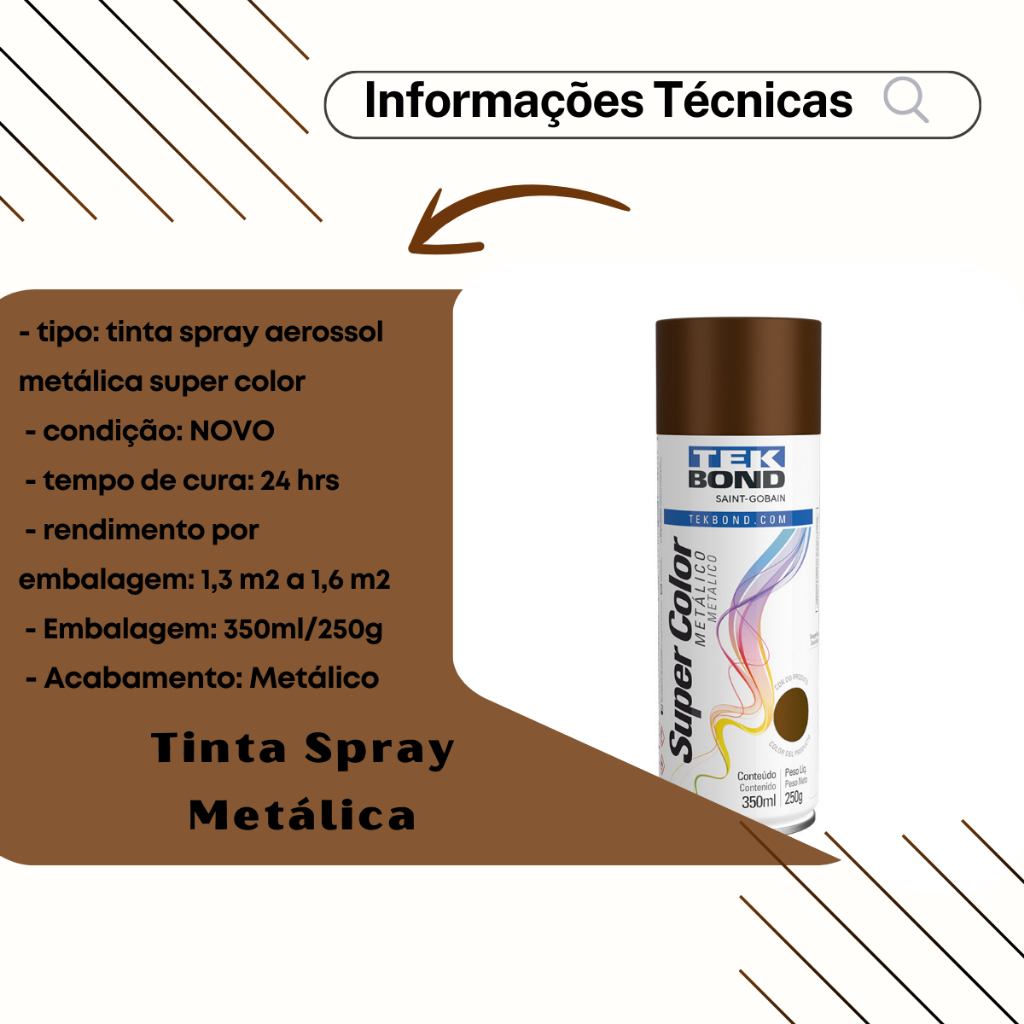 🟤 TINTA SPRAY AEROSSOL BRONZE METÁLICO – 350ML / 250G 🎨 Acabamento metálico brilhante para transformar e renovar superfícies com elegância. 📦 Anúncio referente a 01 unidade 🏷️ DETALHES DO PRODUTO 🏢 Marca: Tekbond 📦 Conteúdo: 350ml / 250g 🎨 Cor: Bronze Metálico 🆕 Condição: Novo 📐 Rendimento Aproximado: 1,3 m² a 1,6 m² por embalagem ⏱️ Cura total: 24h 🧪 Para testes mecânicos: aguardar 72h 🛡️ Garantia: 3 anos (armazenado corretamente) 🔄 Secagem ao toque: 30 minutos 🤲 Para manuseio da peça: 3 horas 🧱 APLICAÇÕES INDICADAS ✔️ Ideal para uso em: 🧲 Metais (ferrosos e não ferrosos) 🪵 Madeiras 🏺 Cerâmica 🧱 Gesso 🎨 Decorações 🛠️ Artesanato em geral 🧰 INSTRUÇÕES DE USO 🔧 Preparo da superfície: 🧼 Remova restos de tinta, ferrugem, gordura e poeira 🧻 Proteja as áreas que não serão pintadas ⚙️ Para metais com ou sem oxidação, aplique Primer Super Color Uso Geral e lixe com lixa d’água 400 🎨 Aplicação: 🖌️ Aplique o spray a 25 cm da superfície, com movimentos constantes 🔄 Aplique de 2 a 3 demãos. A primeira deve ser fina (demão de ancoragem) ⏱️ Aguarde 1 a 3 minutos entre as demãos ✋ Secagem ao toque: 30 minutos 🤲 Manuseio: após 3 horas 🧪 Cura total: 24h (72h para testes mecânicos) 🌀 DICAS IMPORTANTES 🌀 Agite bem a lata em movimentos circulares na base, com a lata na posição vertical 🧽 Limpeza do bico: vire a lata de cabeça para baixo e pressione até sair apenas gás 🧪 Entupimento: mergulhe o bico em Thinner ou acetona, e use uma agulha se necessário 🌡️ Armazenamento: em local ventilado e coberto, temperatura abaixo de 50 °C 🛒 POR QUE COMPRAR CONOSCO? 📦 Envio imediato: Produtos à pronta entrega 🧾 Nota fiscal e garantia em todos os pedidos 🛍️ Carrinho de compras ativo: Compre mais e economize no frete 🧰 Produto novo e original 🏬 Grupo Camillo: Mais de 40 anos com loja física ✅ Produto exatamente igual às imagens do anúncio ⚠️ IMPORTANTE ❗Antes de comprar, esclareça suas dúvidas. 🔒 Devoluções apenas com embalagem original e nota fiscal. 🕑 SUPORTE & ATENDIMENTO 📞 Segunda à Sexta: 08h às 18:30h 📆 Sábados: 08h às 12h 👩🔧 Suporte técnico especializado à disposição