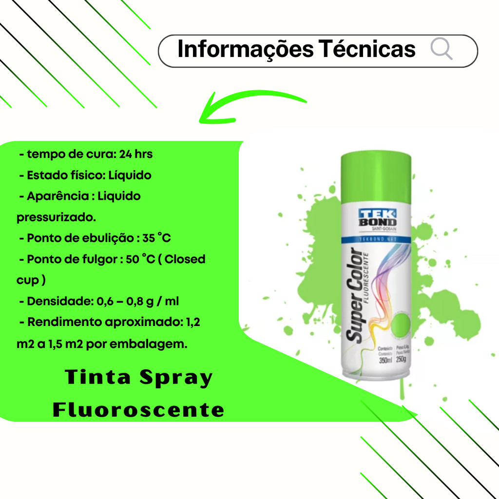 🎨 TINTA SPRAY AEROSSOL FLUORESCENTE VERDE 💡 Brilho Intenso | 🌈 Cor Vibrante | 🖌️ Fácil Aplicação 📦 CONTEÚDO DA EMBALAGEM 1 Tinta Spray Fluorescente Verde – 350ml / 250g 📌 Código da peça: 23513 🏷️ Marca: Tekbond – Saint Gobain 🆕 Condição: Novo ⚙️ ESPECIFICAÇÕES TÉCNICAS 🖌️ Tipo: Tinta Spray Aerossol Fluorescente 🕒 Tempo de cura: 24 horas 🌿 Cor: Verde Fluorescente 🧪 Acabamento: Fosco com brilho sob luz UV ✨ Alta visibilidade e efeito luminoso 🎯 APLICAÇÕES 🛍️ Vitrines de lojas 🎨 Decorações internas 🏫 Escolas 💇♀️ Salões de beleza 🎭 Eventos, festas e palcos 🪵 Materiais: madeira, cerâmica, papel, metal, plástico, entre outros 🛠️ MODO DE USO 🧼 Limpeza: Remova pintura velha, ferrugem, gordura e poeira. 🧻 Proteja as áreas que não serão pintadas. 🔧 Em metais com oxidação, aplique Primer Tekbond Supercolor, espere secar e lixe com lixa d’água 400. 🌀 Agite bem a lata antes do uso e entre demãos. 🎯 Aplique 2 a 3 demãos, começando com uma camada fina para ancoragem. ⏱️ Intervalo entre demãos: 1 a 3 minutos ✋ Toque: 30 minutos | 👐 Manuseio: 3 horas ⏳ Cura total: 24 horas | 🧪 Testes mecânicos: após 72 horas 📏 Rendimento: 1,2m² a 1,5m² por embalagem 📌 Dica: Se a válvula entupir, retire o bico, mergulhe em thinner ou acetona. Use uma agulha para desobstruir se necessário. ✅ BENEFÍCIOS 🌈 Cor fluorescente vibrante e diferenciada 💡 Efeito brilhante com luz negra 🧴 Tinta acrílica com tecnologia de ponta 🖐️ Bico anatômico e confortável 🚫 Não desbota facilmente (uso interno) 🔄 Secagem rápida e excelente acabamento 📌 INFORMAÇÕES ADICIONAIS 📦 Produto disponível para envio imediato 🧾 Novo, com garantia e nota fiscal 🛒 Utilize o carrinho de compras e economize no frete 🖼️ Produto exatamente como nas imagens do anúncio 🔁 Devoluções apenas com embalagem original e nota fiscal 🛡️ GARANTIA ⏱️ Garantia de 90 dias contra defeitos de fabricação 📃 Certificado de garantia deve acompanhar o produto ⚠️ Não cobrimos mão de obra ou má aplicação ⚠️ AVISO IMPORTANTE ❌ Proibido o uso, cópia ou alteração de imagens e textos deste anúncio 🛡️ Protegido pela Lei 9.610/98 – Direitos Autorais 📜 Qualquer uso indevido será tratado legalmente 📞 SUPORTE & ATENDIMENTO 👨🔧 Suporte técnico especializado 🕘 Segunda a Sexta: 08h às 18:30h 🕛 Sábado: 08h às 12h