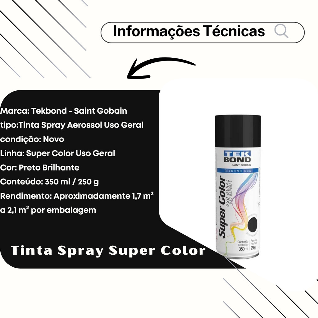 🖤 Tinta Spray Aerossol Preto Brilhante Uso Geral – 350ml / 250g A Super Color Uso Geral da Tekbond é uma tinta acrílica de secagem rápida que proporciona excelentes acabamentos, além de oferecer ótimo poder de cobertura e alta resistência a condições climáticas extremas. Ou seja: total liberdade para usar em ambientes internos e externos! Pode ser aplicada em: 🔩 Ferro 🔧 Aço 🪵 Madeira 🏺 Cerâmica 🧱 Gesso As cores despertam emoções e transformam ambientes! Com a Super Color você cria peças alegres, elegantes e cheias de personalidade. A Super Color Uso Geral da Tekbond transforma sem limites! ✨ 🔢 Referências Compatíveis 23477 69957327011 23011006900 ℹ️ Informações do Produto Marca: Tekbond – Saint Gobain Tipo: Tinta Spray Aerossol Uso Geral Condição: Novo Linha: Super Color Uso Geral Cor: 🖤 Preto Brilhante Conteúdo: 350 ml / 250 g Rendimento: 1,7 m² a 2,1 m² por embalagem ⏱️ Secagem Ao toque: 30 minutos Para manuseio: 3 horas Cura total: 24 horas Testes mecânicos: após 72 horas 🔒 Garantia: 90 dias ❗ Antes de comprar, tire todas as suas dúvidas. 🎯 Aplicações Versátil e ideal para projetos em ambientes internos e externos. Pode ser aplicada em diversas superfícies: 🔩 Ferro e aço 🪵 Madeira 🏺 Cerâmica 🧱 Gesso Proporciona acabamento brilhante, uniforme e resistente. ⭐ Características e Benefícios ⚡ Secagem rápida 🎨 Excelente acabamento 🛡️ Alta durabilidade e resistência 🌦️ Indicada para uso interno e externo 🧱 Adere a ferro, aço, madeira, cerâmica, gesso e mais 🔫 Bico anatômico e confortável 🧰 Fácil aplicação 🛠️ Modo de Uso 🧽 Limpe a superfície: remova pintura antiga, ferrugem, gordura e poeira. 🛡️ Proteja as áreas que não serão pintadas. 🧲 Em metais, use Primer Super Color antes da aplicação. 🔄 Agite bem a lata antes e entre demãos. 🎯 Aplique 2 a 3 demãos com intervalo de 4 a 9 minutos. 🖐️ Para toque: aguarde 30 minutos. 👷 Para manuseio: 3 horas. 🕛 Cura total: 24 horas. 🛠️ Testes mecânicos: somente após 72 horas. 🛒 Onde Comprar com Segurança Adquira agora em uma de nossas lojas oficiais: ✔ Camillo Parts ✔ Genuine Automotive ✔ Edumac Parts Garanta qualidade, procedência, suporte e garantia. ⚖️ Direitos Autorais Proibimos o uso, cópia ou alteração das fotos, imagens e conteúdos deste anúncio. Conforme a Lei 9.610/98, qualquer violação será tratada legalmente. Temos direitos autorais sobre todo o material.