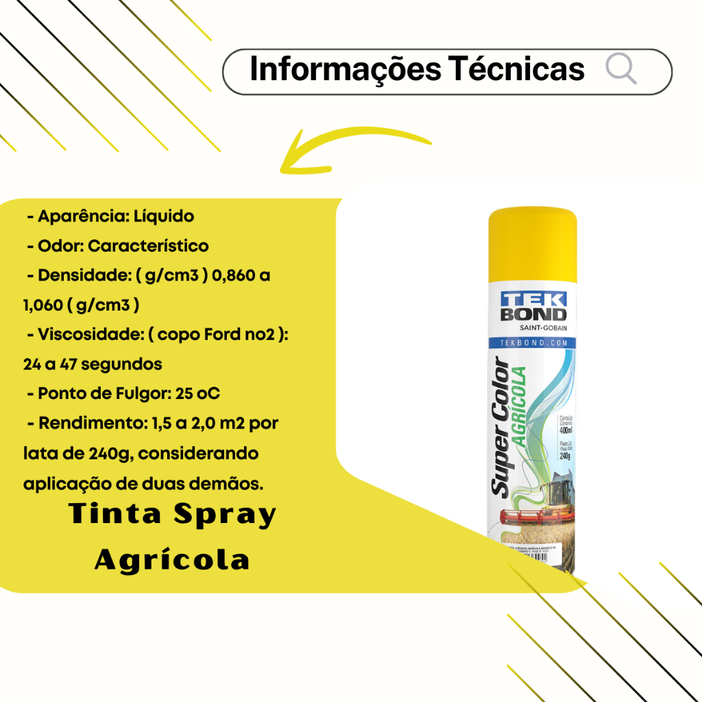 🚜 Tinta Spray Aerossol Super Color Tekbond – Linha Agrícola Amarelo New Holland 400ml / 240g 🔧 Ideal para pequenos reparos e retoques em equipamentos agrícolas metálicos com acabamento profissional, secagem rápida e resistência às intempéries. 📦 Conteúdo da Embalagem 1x Tinta Spray Aerossol Super Color Linha Agrícola 🟨 Cor: Amarelo New Holland 📏 Volume: 400ml / 240g 🔢 Código do Produto: 29766 // 13821006900 🏷️ Marca: Tekbond – Saint-Gobain 🚜 Indicado para Aplicação em Tratores Implementos agrícolas Caminhões Maquinários de metal em geral 💡 Características e Benefícios ✨ Excelente acabamento 🎯 Alto poder de cobertura ⚙️ Alto rendimento ⚡ Secagem rápida entre demãos (1 a 3 minutos) 🌦️ Alta resistência a intempéries 🧾 Instruções de Uso e Manuseio 🔄 Agite bem a lata antes e durante o uso em movimentos circulares 🧪 Teste o bico aplicador antes da aplicação 🧼 Lixe a superfície, se necessário 🎨 Aplique com movimentos constantes e uniformes 🧯 Limpeza da válvula: vire a lata para baixo e pressione até sair apenas gás 📌 Secagem total: 24 horas ⏱️ Intervalo entre demãos: 1 a 3 minutos ✅ Informações Adicionais 📦 Produto em estoque para envio imediato 🆕 Produto novo, com garantia de 90 dias e nota fiscal 🛒 Utilize o carrinho de compras para economizar no frete 📸 Produto exatamente como nas imagens 🔁 Devoluções somente com embalagem original e nota fiscal ⚠️ Aviso Legal 📷 Proibida a cópia ou uso não autorizado de fotos, imagens e textos deste anúncio. 📜 Protegido por direitos autorais – Lei 9.610/98 🛠️ Garantia 🕒 90 dias de garantia contra defeitos de fabricação ❌ Não cobrimos uso indevido do produto 📞 Suporte e Atendimento 🕘 Segunda a Sexta: 08h às 18h30 📅 Sábados: 08h às 12h 👷♂️ Suporte técnico especializado à disposição Adquira agora sua Tinta Spray Tekbond Linha Agrícola – Amarelo New Holland nas lojas oficiais: 🛒 Camillo Parts, Genuine Automotive ou Edumac Parts
