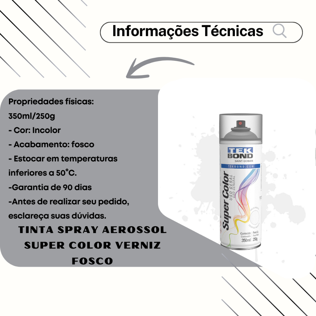 Tinta Spray Aerossol Super Color Verniz Fosco Tekbond Uso Geral 350ml 250g