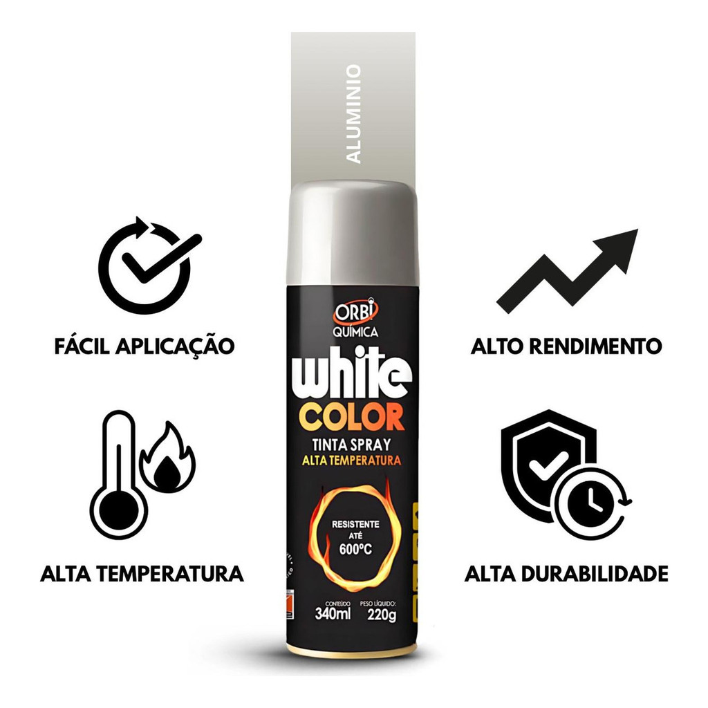 Recomendado por especialistas de tintas! A Orbi Tinta Spray Alta Temperatura 340ml/220g resiste até 600ºC. Indicada para escapamentos de carros e motocicletas, chaminés, lareiras, caldeiras, tubulações e parte externa de churrasqueiras e fogões. ACABAMENTO DISPONÍVEL: • Preto: acabamento PRETO FOSCO (sem brilho). • Alumínio: acabamento METÁLICO BRILHANTE. É livre de chumbo e oferece proteção térmica com excelente durabilidade. ESPECIFICAÇÕES • Resiste até 600ºC • Embalagem: 340ml (220g conteúdo líquido) • Ótima aderência em metais ferrosos e não ferrosos • Pode ser aplicada em madeira, eletrodomésticos e móveis de aço • Alta resistência às intempéries • Secagem ao toque: aproximadamente 10 minutos • Manuseio: 5 horas • Cura total: 24 horas • Aplicação uniforme e sem escorrimentos APLICAÇÕES Uso doméstico: • Churrasqueiras, grelhas e espetos metálicos • Fornos e fogões (parte externa, sem contato com alimentos) • Lareiras e chaminés • Aquecedores e exaustores Uso automotivo: • Escapamentos e coletores • Partes externas do motor (não móveis) • Pinças de freio metálicas expostas ao calor Uso industrial: • Tubulações de aquecimento • Caldeiras e estufas (parte externa) • Equipamentos metálicos expostos a altas temperaturas MODO DE USO • Agite bem antes de usar • Aplique a primeira demão leve para ancoragem • Faça demãos cruzadas e finas • Distância de aplicação: 15 a 20 cm • Intervalo entre demãos: 10 minutos CARACTERÍSTICAS Quantidade: 1 unidade Produto: Tinta Spray Alta Temperatura 340ml / 220g DÚVIDAS FREQUENTES Os produtos são novos? Sim, todos os produtos são novos. Está disponível para envio imediato? Sim, pronta entrega.