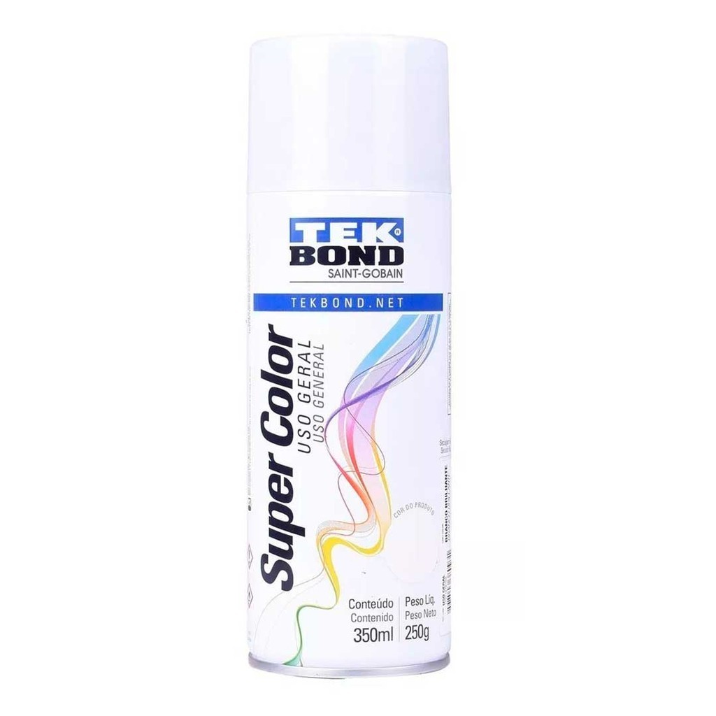 Tinta Spray Branco Brilhante 350ml (250gr) Tekbond - 23021006900 O Tekbond Spray Super Color de Uso Geral foi desenvolvido com resinas acrlicas de secagem rpida e tima resistncia as intempries, proporcionam excelentes acabamentos, poder de cobertura e efeito decorativo. Pode ser utilizada em ambientes internos e externos para aplicaes em ferro, ao, madeira, cermica, gesso, entre outros. Marca: Tekbond Garantia: 3 Anos a partir da data de Fabricao Rendimento: 1,7 a 2,1 m Peso Lquido: 350ml Peso: 250 g Cor: Branco Tempo entre demos: 1 a 3 minutos Tempo de Cura: 24 horas (Padro) e 72 horas (Para testes mecnicos) Peso Bruto: 0.5 kg Imagem Meramente Ilustrativa