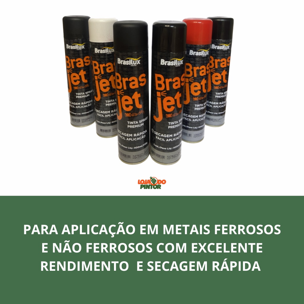 Brasjet Spray Uso Geral APLICAÇÃO Mexer bem a embalagem antes e durante o uso; Aplicar o produto a uma distância de até 30 cm da superfície; Faça a aplicação com movimentos uniformes evitando imperfeições; Aplicar 2 demãos com intervalo entre demãos de até 3 minutos; DESCRIÇÃO Para aplicação em metais ferrosos e não ferrosos com excelente rendimento, secagem rápida combinada a praticidade da embalagem spray, pode ser utilizado em eletrodomésticos, bicicletas, moveis em aço, brinquedos e objetos em geral. Rendimento: de 1,2m² a 1,7 m² por embalagem FERRAMENTAS NECESSÁRIAS O produto já é a ferramenta de aplicação Ao término do uso vire o tubo de ponta cabeça e aperte o bico até que saia apenas gás, evitando o entupimento, se o bico entupir retire-o e coloque em um recipiente com thinner, se precisar utilize uma agulha fina; Produto não indicado para aplicações com umidade elevada ou temperaturas abaixo dos 15ºC; Mantenha o produto em local coberto, seco e arejado longe do calor.