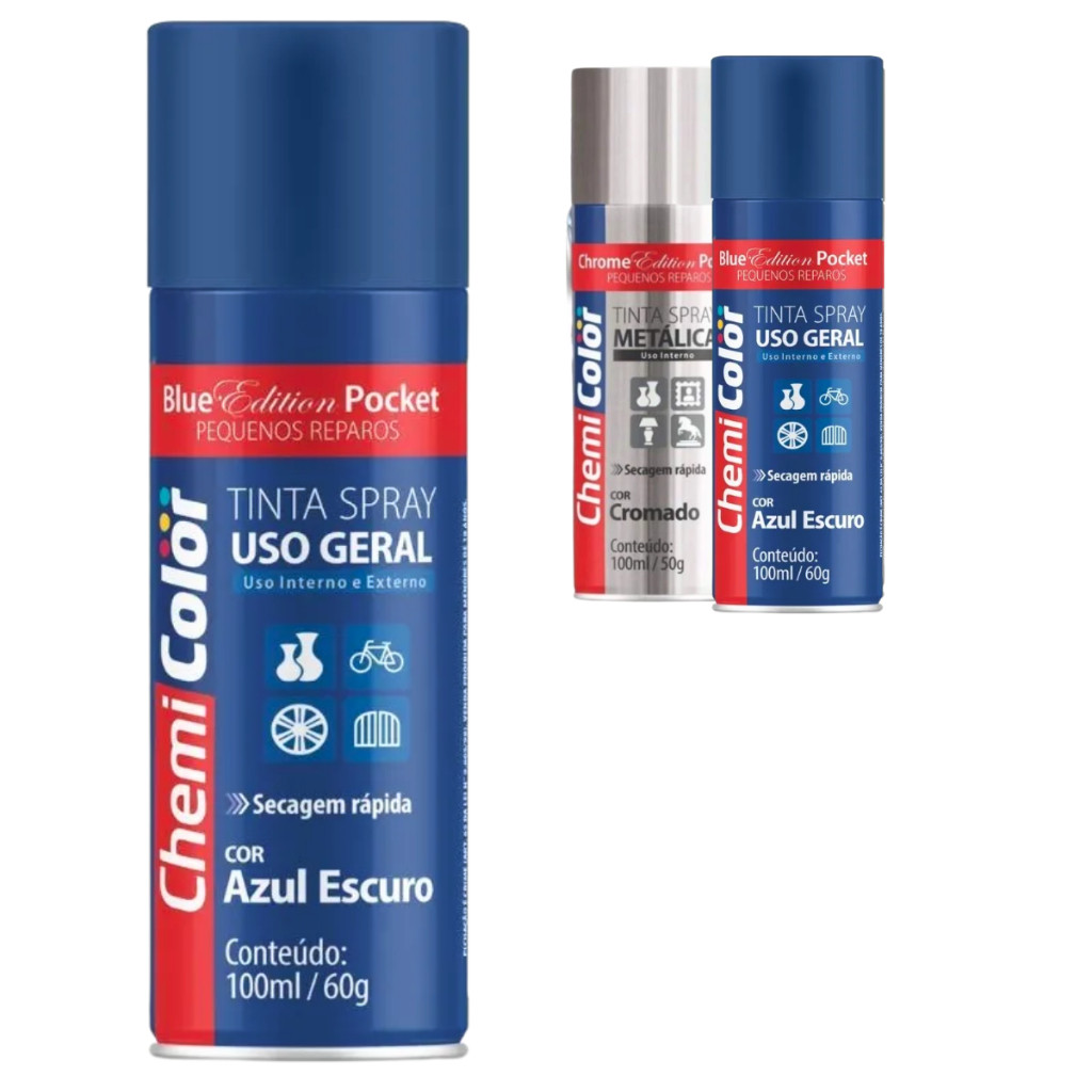 A Tinta Spray Chemicolor Pocket 100ml na cor Azul Escuro é a solução ideal para quem busca praticidade, qualidade e ótimo acabamento em pequenos projetos. Indicada para uso geral, é perfeita para aplicações em madeira, metal, plástico, cerâmica, entre outros materiais. Seu formato compacto facilita o manuseio e a aplicação, tornando-a ideal para artesanato, retoques e personalizações diversas. Com secagem rápida e boa cobertura, proporciona um acabamento uniforme e duradouro. Características: Cor: Azul Escuro Conteúdo: 100ml Uso geral: madeira, plástico, metal, etc. Secagem rápida e fácil aplicação Ideal para pequenos reparos e projetos criativos Praticidade, versatilidade e excelente resultado em uma embalagem compacta! Sem garantia