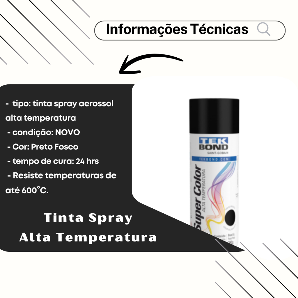 🎨 Tinta Spray Tekbond Preto Fosco – Uso Geral 350ml 🛠️ Acabamento profissional com praticidade! A Tinta Spray Tekbond Super Color Preto Fosco é perfeita para quem busca versatilidade, cobertura uniforme e ótimo rendimento. Desenvolvida para uso geral, pode ser aplicada em diversos materiais com facilidade e secagem rápida. 📋 Informações do Produto 🏷️ Marca: Tekbond – Saint-Gobain 🆕 Condição: Novo 🎨 Cor: Preto Fosco 🧪 Tipo: Tinta Spray Acrílica 📦 Conteúdo: 350ml 🔄 Rendimento Aproximado: 1,3 m² a 1,6 m² por embalagem ⏳ Cura Total: 24 horas (72h para testes mecânicos) ⏱️ Secagem ao toque: 30 minutos 💼 Garantia: 90 dias 🛠️ Modo de Uso Preparo da Superfície: 🧽 Remova resíduos de pintura velha, ferrugem, gordura e poeira. 🧻 Proteja as partes que não serão pintadas com papel ou plástico. ⚙️ Para metais com ou sem oxidação, aplique Fundo Primer Tekbond, aguarde secar e lixe com lixa d’água 400. Aplicação: 🌀 Agite bem a lata antes do uso. 📏 Aplique a 25 cm da superfície, com movimentos constantes e uniformes. 🖌️ Aplique de 2 a 3 demãos. A primeira deve ser fina para melhor ancoragem. ⏱️ Intervalo entre demãos: 1 a 3 minutos. 👆 Toque seco: 30 minutos. 📦 Manuseio da peça: 3 horas. 🔒 Cura total: 24 horas. 💡 Dicas e Observações 🔁 Limpeza do bico: Após o uso, vire a lata de cabeça para baixo e pressione até sair apenas gás. 🧼 Em caso de entupimento, mergulhe o bico em thinner ou acetona. 📏 Agite com movimentos circulares na base da lata (posição vertical). 🌡️ Armazenar em local ventilado e coberto (máx. 50°C). 🧴 Utilize verniz Tekbond para acabamento extra, disponível na linha Super Color. 🎯 Ideal Para: 🪵 Madeira 🧱 Metal 🎨 Artesanato 🔧 Retoques e pequenos reparos 🧰 Uso geral em ambientes internos e externos 🛍️ Por Que Comprar Com a Gente? 📦 Produto original, com nota fiscal e garantia 🛒 Carrinho de compras ativo: adicione mais itens e economize no frete! ✅ Produto igual às imagens 📬 Pronta entrega – estoque à disposição ♻️ Devolução apenas com embalagem lacrada e NF 🧑🔧 Suporte e Atendimento 🕗 Segunda a Sexta: 08h às 18:30h 📅 Sábados: 08h às 12h 🛠️ Equipe de atendimento técnico especializado ⚖️ Aviso Legal 📸 Imagens e textos protegidos por direitos autorais – Lei 9.610/98. ❌ Proibido uso, cópia ou alteração sem autorização.