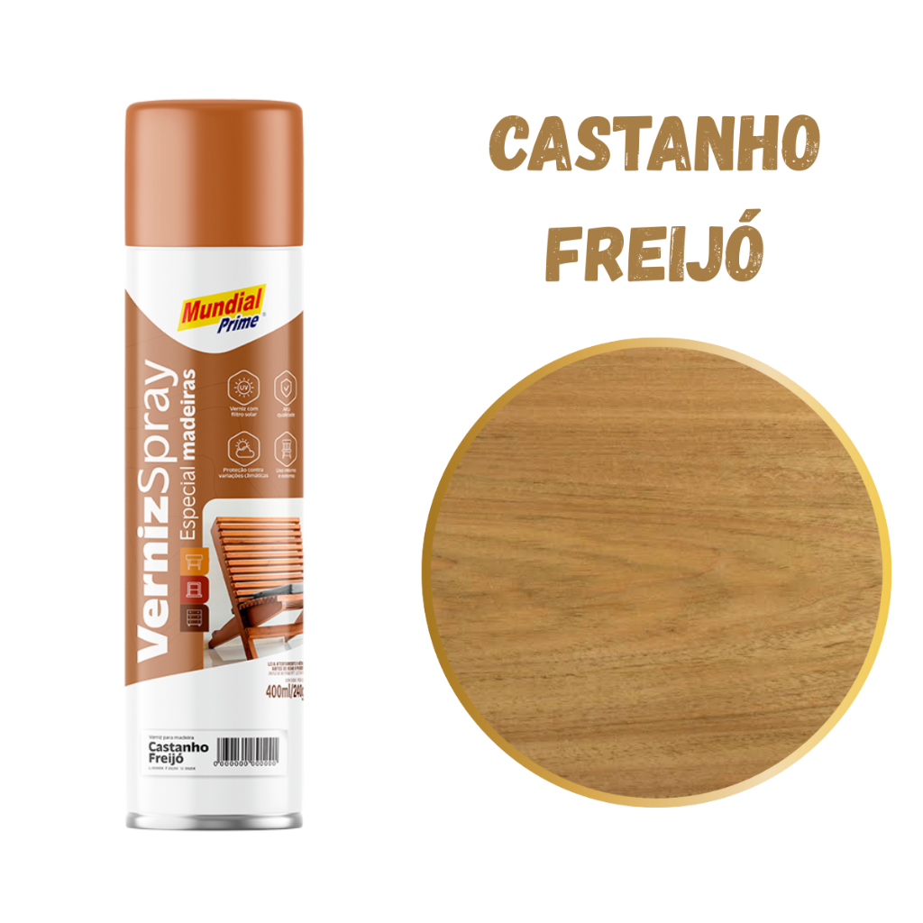 Seja bem vindo a R&A! KIT 2 UNIDADES - VERNIZ PARA MADEIRAS 400ML. Cores: CASTANHO FREIJÓ, CEREJEIRA E NATURAL O Verniz para Madeira Mundial Prime, é uma linha em aerossol desenvolvida para proteger e embelezar móveis e objetos de madeira. Com uma fórmula de alta qualidade, garante uma aparência impecável por muito mais tempo. Além de proteger contra os raios ultravioletas e umidade, também oferece a opção de adicionar um toque de cor à peça. Seja para harmonizar com o restante da decoração ou para dar um visual completamente novo. Com a aplicação fácil e rápida, renova a beleza de móveis, portas, janelas, armários e outros itens de madeira, aumentando consideravelmente sua vida útil. INSTRUÇÃO DE USO PREPARO DA SUPERFÍCIE: Para madeira nova deve ser lixado a superfície iniciando com lixa grana 220 até 360, seguindo os veios da madeira. Para madeiras pintadas deve ser removido toda tinta com lixa ou solvente e tratada como madeira nova. A superfície a ser pintada deve ser limpa e seca adequadamente, e deve estar livre de gordura, poeira, ferrugem, resíduos de tinta ou verniz velho, etc. Proteja as áreas que não será pintada com papelão, plástico ou revestindo com papel. MODO DE USAR Aplique de 2 a 3 demãos com intervalo de 15 minutos entre elas. Se utilizar seladora de madeira, aplique primeiro 3 demãos do produto em intervalos de 15 minutos entre elas, deixe secar por 1 hora e lixe com lixa grana 360/400 e em seguida aplique o verniz. O tempo de secagem entre demãos é de 15 minutos, para manuseio de 5 a 6 horas, secagem total após 24 horas. APLICAÇÕES Pode ser aplicado em diversos tipos de superfícies de madeira para realçar a beleza e proteger contra o desgaste. Olá! Somos uma empresa especializada em vendas de produtos para higienização de estofados e limpeza em geral! Ficaremos muito felizes de te ajudar em qualquer duvida, estamos prontos para embalar e enviar seus produtos o mais rápido possível! Ate breve e boas compras!