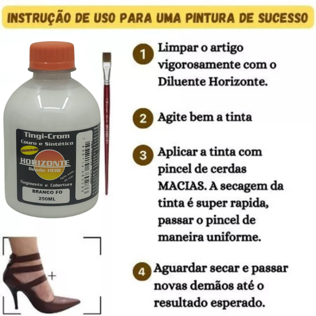 Tintas horizonte para couros lisos e sintéticos. Destinado a renovação e mudança de cor com praticidade e segurança. *Não sai na roupa ou no contato com a água. Não agride o couro *Alta durabilidade. Modo de usar: Limpe o local, e com um pincel aplique suavemente, dê as d'mãos que achar necessário. Para cada d'mão espere 1 hora, secagem completa 12 horas. Para finalizar após secar aplique o hidratante para couro.