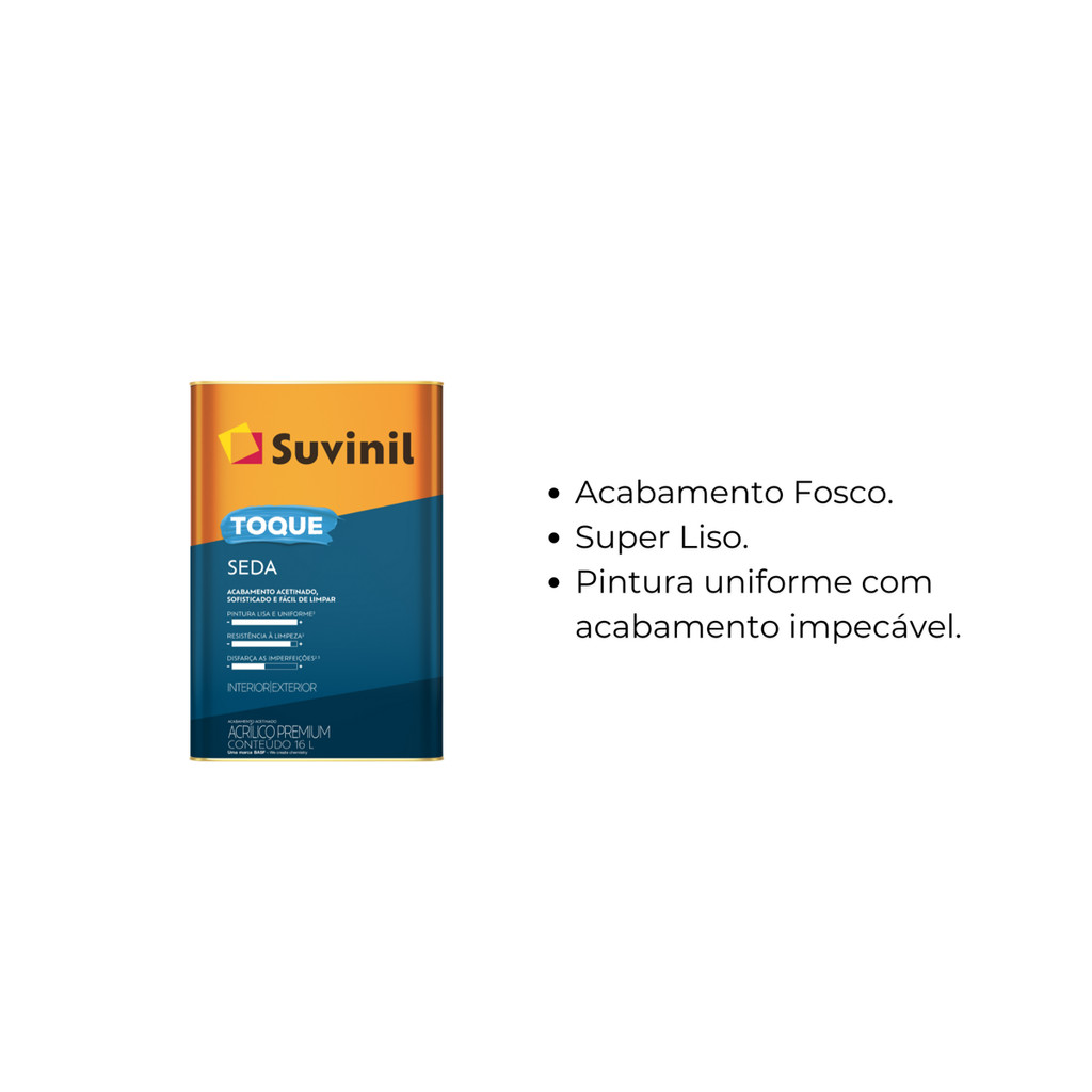 Procurando uma tinta com acabamento acetinado? Escolha a Suvinil Toque Seda. Ela traz mais sofisticação para as superfícies. Na escala de benefícios, ela entrega máxima performance em pintura lisa e uniforme, ótima resistência à limpeza e disfarce melhor de imperfeições em comparação com a Suvinil Toque Brilho. Essa tinta para parede pode ser usada nas superfícies internas de reboco, massa acrílica, massa corrida, gesso, textura, fibrocimento e concreto. Marca: Suvinil Acabamento: Acetinado Ambiente indicado: Internos e Externos Superfícies indicadas: Pintura de superfícies externas e internas de reboco, massa acrílica, texturas, concreto, fibrocimento e superfícies internas de massa corrida e gesso. Linha: Toque Seda Tipo de Tinta: Acrílico Premium Volume da embalagem: 16L Rendimento acabado (16L): até 102m² Secagem ao toque: 2 horas Secagem entre demãos: 4 horas Secagem final: 12 horas É inflamável? Não Ferramenta indicada para aplicação: Rolo de lã ou trincha. Números de demãos indicadas: 2 a 3 (O número de demãos pode variar dependendo da superfície e cor escolhida) Resistência à abrasão úmida com pasta abrasiva de acordo com a ABNT NBR 14940 (lavabilidade): = 150 ciclos Poder de cobertura seca de acordo com a ABNT NBR 14942: = 5 m2/litros Poder de cobertura de tinta úmida de acordo com a ABNT NBR 14943: = 92,0 % Resistência ao crescimento de fungos em placa de Petri, com lixiviação de acordo com a ABNT NBR 15987: Resiste Brilho de acordo com a ABNT NBR 15299: 11 = UB