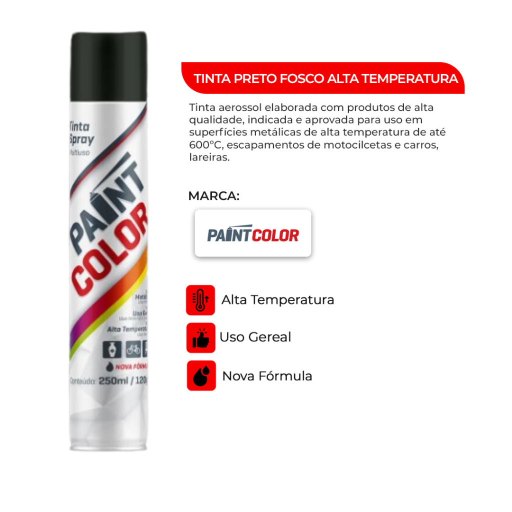 TINTA SPRAY ALTA TEMPERATURA – RESISTENTE ATÉ 600°C (Não recomendada para superfícies em contato com alimentos) A Tinta Spray Alta Temperatura Paintcolor foi desenvolvida com matérias-primas de alta qualidade para oferecer resistência, cobertura uniforme e excelente acabamento em superfícies metálicas expostas a calor intenso, suportando até 600°C após o processo de cura. Indicações de uso: Escapamentos de motocicletas e automóveis Lareiras, churrasqueiras e fornos industriais Estruturas metálicas sujeitas a altas temperaturas Preparação da superfície: Limpe bem, removendo poeira, graxas, óleos, ceras e resíduos. Lixe, se necessário, para eliminar imperfeições. Modo de aplicação: Agite bem a lata antes e durante o uso. Faça um teste prévio pressionando a válvula para verificar o jato. Pulverize a 10–20 cm de distância, com movimentos uniformes e cruzados. Aplique várias demãos finas com intervalo de 5 a 10 minutos entre cada uma. Secagem: Ao toque: 20 minutos Manuseio: 2 horas Secagem total: 24 horas Cura térmica obrigatória: Após a aplicação, submeta a superfície a 250°C por 1 hora para atingir a resistência máxima de até 600°C. Segurança: Produto inflamável – mantenha longe do fogo e superfícies aquecidas Não perfurar ou incinerar a embalagem, mesmo vazia Evitar inalação, contato com pele e olhos Não ingerir Em caso de contato com olhos/pele, lavar com água em abundância Em caso de ingestão, não provocar vômito e procurar atendimento médico (CIT/RS: 0800 721 3000) Armazenamento: Conservar em local fresco, ventilado e protegido do sol Não expor a temperaturas acima de 50°C - O valor do anúncio é referente a 1 unidade de tinta. Na Virtual, somos reconhecidos pela excelência em fornecer peças e acessórios automotivos de qualidade. Nossa prioridade é a satisfação do cliente. • Emissão de Nota Fiscal: Garantia e segurança em suas compras. • Envio em até 24 horas: Agilidade para que você receba seu produto rapidamente. • Atendimento via Chat: Suporte rápido e eficiente para esclarecer suas dúvidas. Escolha a Virtual e aproveite uma experiência de compra excepcional com produtos que fazem a diferença no seu veículo!