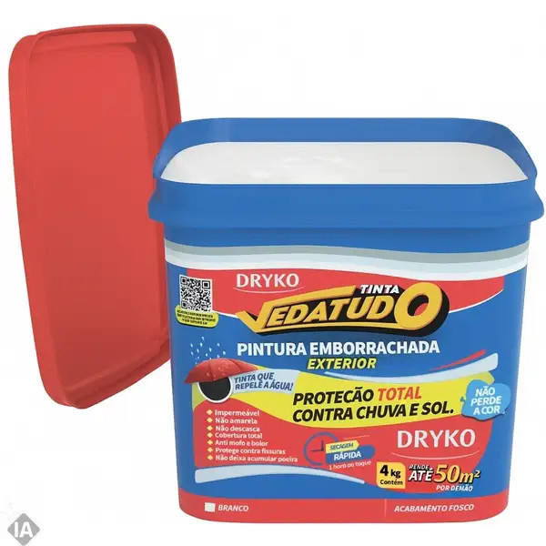 Descrição: Tinta Emborrachada Branca 4 KG VEDATUDO DRYKO A Tinta Emborrachada Branca VEDATUDO DRYKO é a solução ideal para quem busca proteção duradoura contra infiltrações e microfissuras em fachadas, muros e paredes externas. Com sua fórmula elástica de alto desempenho, o produto oferece um revestimento que acompanha os movimentos naturais da estrutura, evitando o surgimento de trincas e descascamentos. Além disso, garante acabamento uniforme, resistência superior às intempéries e excelente durabilidade mesmo em ambientes expostos ao sol, chuva e variações de temperatura. Com tecnologia de ponta, a pintura cria uma barreira hidro-repelente que evita a penetração de água, protegendo a superfície contra mofo, fungos e manchas. Sua cor branca apresenta resistência ao amarelamento, preservando o visual estético por muito mais tempo. Outro diferencial é o seu poder de correção de superfícies, já que auxilia no preenchimento de microfissuras, proporcionando um resultado mais bonito e funcional. Trata-se de um produto versátil e indispensável para obras residenciais, comerciais e industriais que exigem alta performance em proteção e acabamento. Além da eficiência técnica, a aplicação da Tinta Emborrachada VEDATUDO é prática e pode ser feita com rolo de lã, pincel, trincha ou até mesmo máquina airless, sempre respeitando as recomendações de preparo e intervalos entre as demãos. Com rendimento otimizado e cura rápida, oferece praticidade para profissionais da construção civil e também para quem busca soluções seguras e eficazes em reformas domésticas. Características Técnicas: Tinta Emborrachada Branca 4kg VEDATUDO DRYKO Embalagem: 4kg Acabamento: Branco Indicação: Fachadas, muros e paredes com infiltrações e microfissuras Tempo entre demãos: 2 a 3 horas (dependendo da ventilação e temperatura) Validade: 24 meses a partir da fabricação Aplicação: Rolo de lã, pincel, trincha ou máquina airless Condições de armazenamento: local coberto, seco e ventilado, até 30°C Marca: DRYKO Garantia: 3 meses Benefícios: Proteção total contra infiltrações, evitando danos estruturais Correção de microfissuras, garantindo acabamento uniforme Alta resistência às intempéries, ideal para áreas externas Ação hidrorrepelente, que impede a absorção de água Evita a formação de mofo e fungos Cor branca com resistência ao amarelamento Fácil aplicação, com diferentes ferramentas de pintura Revestimento elástico e durável Evita descascamento da pintura com o tempo Excelente custo-benefício para reformas e manutenções Detalhes Adicionais O produto é indicado tanto para profissionais da construção civil quanto para proprietários que desejam uma solução prática e durável contra infiltrações. Sua formulação elástica e de alto desempenho torna-se um diferencial em obras que demandam resistência superior. Além disso, o uso de EPIs durante a aplicação garante segurança no manuseio, especialmente em locais fechados, onde pode ser necessário criar ventilação forçada. Público-Alvo: Ideal para profissionais de pintura, construtores, engenheiros e também para usuários domésticos que buscam proteger e valorizar imóveis residenciais e comerciais. O produto é recomendado para quem precisa de uma solução de alta performance em vedação e estética. Diferenciais: A Tinta Emborrachada VEDATUDO DRYKO se destaca por unir durabilidade, eficiência e versatilidade. Diferente das tintas convencionais, ela não apenas colore a superfície, mas cria uma camada protetora inteligente que acompanha os movimentos estruturais e prolonga a vida útil da construção. É um produto de confiança, amplamente reconhecido no mercado pela qualidade da marca DRYKO. Curiosidades: O conceito de pintura emborrachada foi desenvolvido para oferecer uma camada protetora flexível, que além de embelezar, atua como vedação contra infiltrações. Por isso, é muito utilizada em regiões úmidas ou com grande variação de clima, garantindo maior segurança e estética às construções. Garanta já a sua Tinta Emborrachada Branca 4kg VEDATUDO DRYKO e proporcione máxima proteção, resistência e durabilidade às suas superfícies.