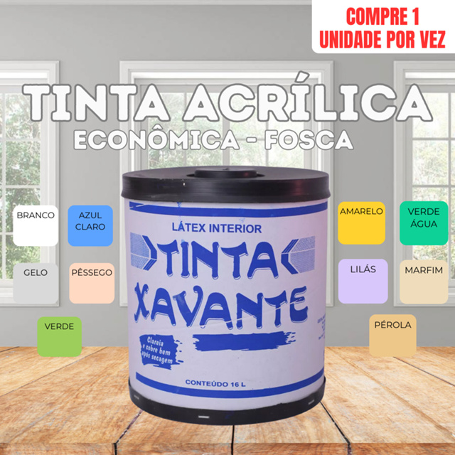 Tinta Econômica Fosca Xavante Imperio 16L – Uso Interno ATENÇÃO: DEVIDO AO LIMITE DE PESO, ENVIAMOS SOMENTE 1 UNIDADE POR PEDIDO. SE HOUVER COMPRA DE MAIS UNIDADES, APENAS 1 SERÁ ENVIADA. A Tinta Xavante Econômica Fosca 16L é ideal para quem busca bom rendimento, cobertura uniforme e excelente custo-benefício. Indicada para pinturas residenciais, comerciais e reformas em geral, proporciona um acabamento fosco bonito e homogêneo. Perfeita para quem precisa pintar grandes áreas gastando menos. Características do Produto: Tipo: Tinta econômica fosca Conteúdo: 16 litros Acabamento: Fosco Aplicação: Interna Rendimento: Alto (depende da superfície) Secagem: Rápida Fácil aplicação com rolo, pincel ou pistola Superfícies Indicadas: Reboco Concreto Massa corrida Gesso Blocos Paredes internas Cores Disponíveis: Branco Gelo Pêssego Verde Verde água Pérola Amarelo Marfim Azul claro Benefícios: ✔ Ótimo custo-benefício ✔ Boa cobertura ✔ Acabamento fosco uniforme ✔ Ideal para grandes áreas ✔ Produto pronto para uso (pode ser diluído conforme necessidade) Dicas de Uso: A superfície deve estar limpa, seca e sem poeira ou gordura. Pode ser diluída com água conforme indicação do fabricante. Recomenda-se de 2 a 3 demãos para melhor acabamento.