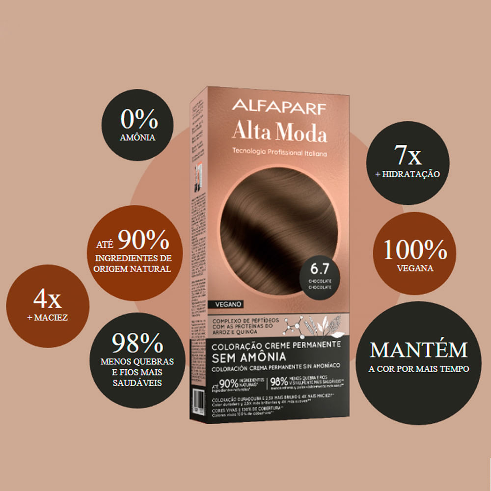 A Tintura Alta Moda Sem Amônia 4.0 Castanho foi especialmente enriquecida com peptídeo e com proteínas do arroz e da quinoa, que são verdadeiros aliados para saúde dos fios, pois penetram profundamente na fibra, melhorando a captação da cor e retendo-a por mais tempo. Além disso, possui cobertura duradoura e vibrante, sem qualquer dano á estrutura capilar, age diretamente no córtex transformando os pigmentos naturais. Cobre 100% dos fios brancos e possui fórmula vegana. Benefícios: - Livre de amônia; - Enriquecida com peptídeo; - Clareamento de até 3 tons; - Cobertura 100% de fios brancos. Modo de usar: Em um recipiente não metálico, coloque toda a bisnaga de coloração, mexa bem este creme puro para torná-lo uma massa. Aos poucos, adicione a emulsão e misture com o pincel até obter uma massa homogênea; Inicie a aplicação pela fronte ou pela região onde existe maior concentração de cabelos brancos, distribuindo a coloração por todo o cabelo; Deixe o produto agir. Após isso, com as mãos/luvas, massageie toda a cabeça e os cabelos por alguns minutos, garantindo a distribuição da coloração por todo o cabelo. Enxágue muito bem até a completa retirada da coloração. Sobre a marca: O Grupo Alfaparf está há mais de 30 anos no mercado internacional de cosméticos, atuando em 80 países e atendendo aos melhores salões do mundo. Com expertise na área capilar, o grupo iniciou sua atuação junto ao consumidor final no Brasil através da Alfaparf Cosmética Di Tratamento. Destaca-se pelo sucesso de suas linhas junto à mulher brasileira.