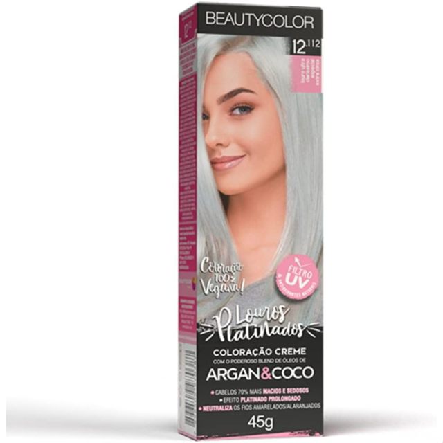 Coloração Individual Beautycolor 12.112 Louro Ultra Claríssimo Especial Extra Cinza Enriquecida com os queridinhos Argan e Coco, a nova fórmula de Coloração Beautycolor oferece toda a tecnologia profissional, com alta duração, proteção uv e cores ainda mais intensas. O motivo desse sucesso é porque a nova fórmula conta com complexos hidra nutritivos, ricos em aminoácidos essenciais e proteínas vegetais, que em conjunto com um blend de óleos poderosos em nutrição, proporcionam além de cores radiantes, cabelos profundamente hidratados, macios e super brilhantes, resultando é claro, em soluções simplesmente perfeitas! Com a Coloração Beautycolor a mudança é possível, de forma saudável e segura. Perfeita cobertura de fios brancos; Hidratação profunda; Super brilho; Durabilidade e fixação da cor; Restaura e fortalece os fios; Cabelos macios e uniformizados; Exclusivo blend de óleos; Coloração em creme. Modo de uso: Usar de modo habitual