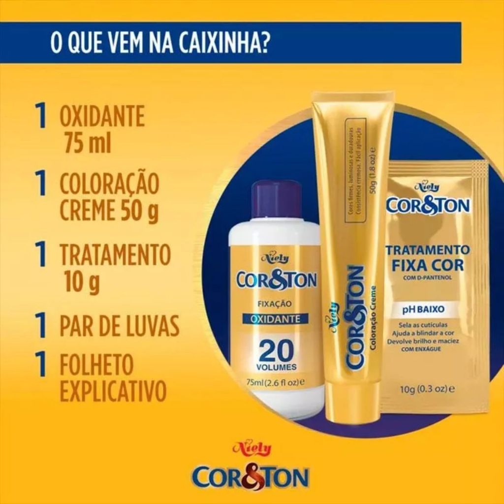 Tintura Cor&Ton Niely Mimi Kit 6.7 Chocolate Principais Características Cor Rica e Duradoura: A tintura Cor&Ton Niely Mimi Kit 6.7 proporciona um tom de chocolate intenso e vibrante, que garante uma cor bonita e duradoura. Fórmula Suavizante: A fórmula especial do produto é enriquecida com ativos que ajudam a cuidar dos fios enquanto os colorem, proporcionando mais brilho e suavidade. Praticidade no Aplicação: A embalagem vem com todos os itens necessários para uma aplicação prática e rápida, ideal para quem busca facilidade no processo de coloração em casa. Benefícios Cabelos Hidratados e Brilhantes: Além de colorir, a tintura ajuda a manter os fios hidratados, proporcionando um brilho saudável. Cobertura Completa dos Fios Brancos: Oferece uma cobertura eficaz dos fios brancos, garantindo uma cor uniforme e natural. Praticidade no Dia a Dia: O kit completo facilita o processo de coloração, sem a necessidade de aditivos adicionais, tornando a aplicação mais simples. Diferenciais do Produto Ação Cuidadosa: Além de proporcionar a coloração, o produto contém ativos que cuidam da saúde dos fios, deixando-os mais suaves e com aspecto saudável. Fácil de Usar em Casa: O kit inclui todos os componentes necessários para realizar a coloração em casa de forma prática e eficiente, sem complicação. Marca Confiável: Niely é uma marca de referência no mercado de tinturas, conhecida pela qualidade e eficácia de seus produtos. Especificações Técnicas Peso: 40g (Kit completo). Instruções de Uso Misture a tintura com o revelador (incluso) conforme as instruções do fabricante. Aplique a mistura nos cabelos secos e não lavados, começando pela raiz até as pontas. Deixe agir pelo tempo recomendado e enxágue abundantemente. Após a aplicação, use o condicionador para garantir maciez e brilho aos fios. Avisos e Precauções Não utilizar o produto se o couro cabeludo estiver irritado ou danificado. Evite o contato com os olhos. Caso isso aconteça, enxágue imediatamente com água em abundância. Realize o teste de alergia 48 horas antes da aplicação para garantir que não ocorrerá reação. Mantenha fora do alcance de crianças. Armazenar em local fresco e seco. O que está incluso? 1 Kit Tintura Cor&Ton Niely Mimi Kit 6.7 Chocolate (inclui tintura e revelador). ---- DÚVIDAS FREQUENTES ---- Os produtos são originais?Sim. Todos os nossos produtos são originais. Emitem nota fiscal?Sim. Emitimos nota fiscal para todos os pedidos.