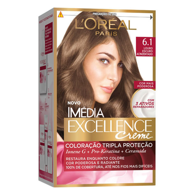 TINTURA CREME IMÉDIA EXCELLENCE L'ORÉAL LOURO ESCURO ACINZENTADO 6.1 Coloração Tripla Proteção: Ionene G + Pro-Keratina + Ceramida Restaura enquanto colore. Cor poderosa e radiante. Com 3 ativos repar