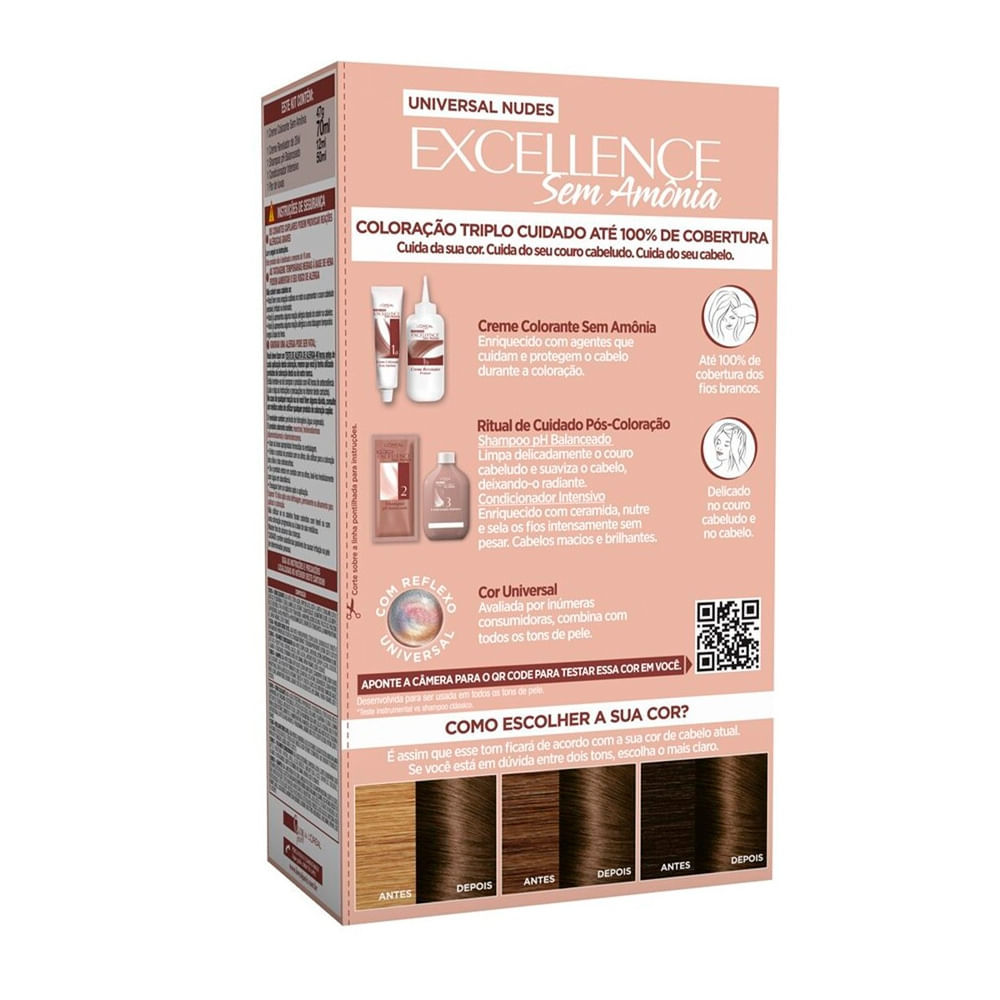 A Tintura Excellence Universal Nudes Sem Amônia Preto Universal 2U foi especialmente desenvolvida sem a presença de amônia em sua fórmula. Possui toda intensidade de uma coloração permanente, porém em uma fórmula sem amônia, que é ideal para fornecer resultados naturais e duradouros, garantindo uma aparência saudável aos fios. Sua fórmula, conta com agentes que cuidam e protegem os fios durante a coloração. Além disso, cobre até 100% dos fios brancos e uma cor uniforme e duradoura sem deixar de lado o cuidado. Conta ainda com a nova tecnologia Reflexo U oferecemos uma gama de tons universais, criada a partir da mistura única de reflexos frios e quentes, proporcionando uma coloração de resultado harmonioso e natural em todos os tons de pele. Benefícios: - Fórmula sem amônia; - Cobre até 100% dos fios brancos; - Proporciona menos quebra dos fios; - Resultado harmonioso e natural. Modo de usar: Passo 1: Faça o teste de mecha para garantir que a cor da coloração Excellence Sem Amônia escolhida trará o resultado esperado. Passo 2: Com as luvas colocadas, misture o Creme Colorante Sem Amônia 1A com o Creme Revelador Protetor 1B e agite bem até que a cor do frasco mude. Passo 3: Divida o cabelo ao meio e começe aplicando a coloração nas raízes, seção por seção, com o auxilio do bico aplicador. Distribua o restante do produto no comprimento e nas pontas, massageando suavemente. Passo 4: Deixe atuar por 30 minutos. Passo 5: Passados os 30 minutos, lave o cabelo usando o Shampoo pH Balanceado que vem dentro do kit, para uma limpeza delicada do couro cabeludo e deixar os fios radiantes Passo 6: Enxágue o cabelo e passe o Condicionador Intensivo, para nutrir intensamente e selar os fios, resultando em cabelos nutridos, macios e brilhantes. Passo 7: Enxágue o cabelo novamente com água abundante. Sobre a marca: L'Oréal Paris é a marca de cosméticos líder mundial que permite que o melhor da beleza esteja disponível e acessível a todos. Desde maquiagem e cuidados com a pele, àcuidados com os cabelos e coloração, nosso espírito pioneiro lidera nossa excelência científica e constante busca por inovação. Estamos comprometidos com a segurança, eficácia e qualidade há mais de 110 anos. Como uma marca que sempre defendeu e comemorou o empoderamento das mulheres, L'Oréal Paris desafia os estereótipos com uma visão moderna da feminilidade. Na verdade, apoiamos todas as mulheres em sua jornada para que se sintam realizadas de acordo com suas próprias regras e desejos.