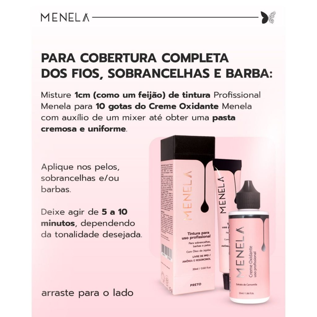 Tintura para Sobrancelhas Menela - Definição Natural e Reconstrução A nova Tintura para Sobrancelhas Menela é a aliada perfeita para sobrancelhas naturalmente definidas e revitalizadas. Com uma fórmula inovadora, enriquecida com Óleo de Jojoba, proporciona nutrição intensa, brilho e fortalecimento dos fios, garantindo um resultado impecável e de longa duração. Livre de PPD, amônia e resorcinol, a tintura Menela é segura para todos os tipos de pele e pelos, incluindo os mais sensíveis. Diferenciais da Tintura para Sobrancelhas Menela - Óleo de Jojoba --> Nutrição profunda e brilho intenso. - Livre de PPD, amônia e resorcinol --> Menos agressiva, mais segura e dermatologicamente testada. - Ação Beauty Repair --> Reconstrói, fortalece e protege as sobrancelhas. - Cobertura completa de fios brancos --> Pigmentação intensa e uniforme. - Fórmula vegana e Cruelty-Free --> Não testada em animais. - Versatilidade --> Pode ser usada para sobrancelhas, barba e brow lamination. - Disponível em 6 tonalidades para atender diferentes perfis de clientes. Resultados Visíveis e Personalizados - Acabamento natural --> Sobrancelhas suavemente pigmentadas. - Acabamento médio --> Maior definição sem perder a naturalidade. - Acabamento marcado --> Sobrancelhas intensas e bem preenchidas. - Adaptação para todos os tipos de pele e pelos --> Excelente fixação e durabilidade. Modo de Uso da Tintura Menela 1. Preparação --> Limpe bem a área de aplicação, removendo qualquer resíduo de maquiagem, oleosidade ou impurezas. 2. Mistura --> Combine a tintura com o creme oxidante Menela na proporção correta para obter uma textura homogênea. 3. Aplicação --> Aplique a mistura uniformemente sobre os pelos da sobrancelha ou barba. 4. Tempo de ação --> Deixe agir de 5 a 15 minutos, conforme o efeito desejado. 5. Cobertura de fios brancos --> Para máxima cobertura, use uma mistura mais concentrada e deixe agir por até 15 minutos. 6. Remoção --> Utilize um algodão umedecido em água para remover o excesso de produto. Precauções e Segurança - Realize um teste de toque 72 horas antes da aplicação para evitar possíveis reações alérgicas. - Siga corretamente as instruções de uso para garantir segurança e melhores resultados. - Evite contato com os olhos. Em caso de contato, enxágue imediatamente com água em abundância. - Não utilize o produto em pele irritada, ferida ou sensível sem consultar um profissional. - Mantenha fora do alcance de crianças e armazene em local fresco e arejado. Perguntas Frequentes 1. A Tintura para Sobrancelhas Menela é segura para peles sensíveis? - Sim! A fórmula livre de PPD, amônia e resorcinol reduz significativamente o risco de irritação, tornando-a ideal para peles sensíveis. 2. Quanto tempo dura o efeito da tintura Menela? - A durabilidade pode variar conforme o tipo de pele e cuidados pós-aplicação, mas em média dura até 15 dias. 3. A tintura cobre 100% dos fios brancos? - Sim! A fórmula proporciona cobertura total dos fios brancos, garantindo um tom uniforme e natural. 4. Posso usar a tintura na barba? - Sim! A tintura Menela é versátil e pode ser usada na barba, garantindo um acabamento impecável e natural. 5. A tintura Menela pode ser usada para Brow Lamination? - Sim! Sua fórmula é compatível com brow lamination, proporcionando um efeito duradouro e natural. 6. Como fazer a tintura durar mais? - Evite produtos oleosos na área pigmentada. - Não esfregue a região nos primeiros dias. - Hidrate os fios regularmente para manter a cor vibrante. A Tintura para Sobrancelhas Menela é a solução perfeita para profissionais que buscam qualidade, segurança e resultados impecáveis. Experimente e surpreenda suas clientes com sobrancelhas perfeitamente definidas e revitalizadas!