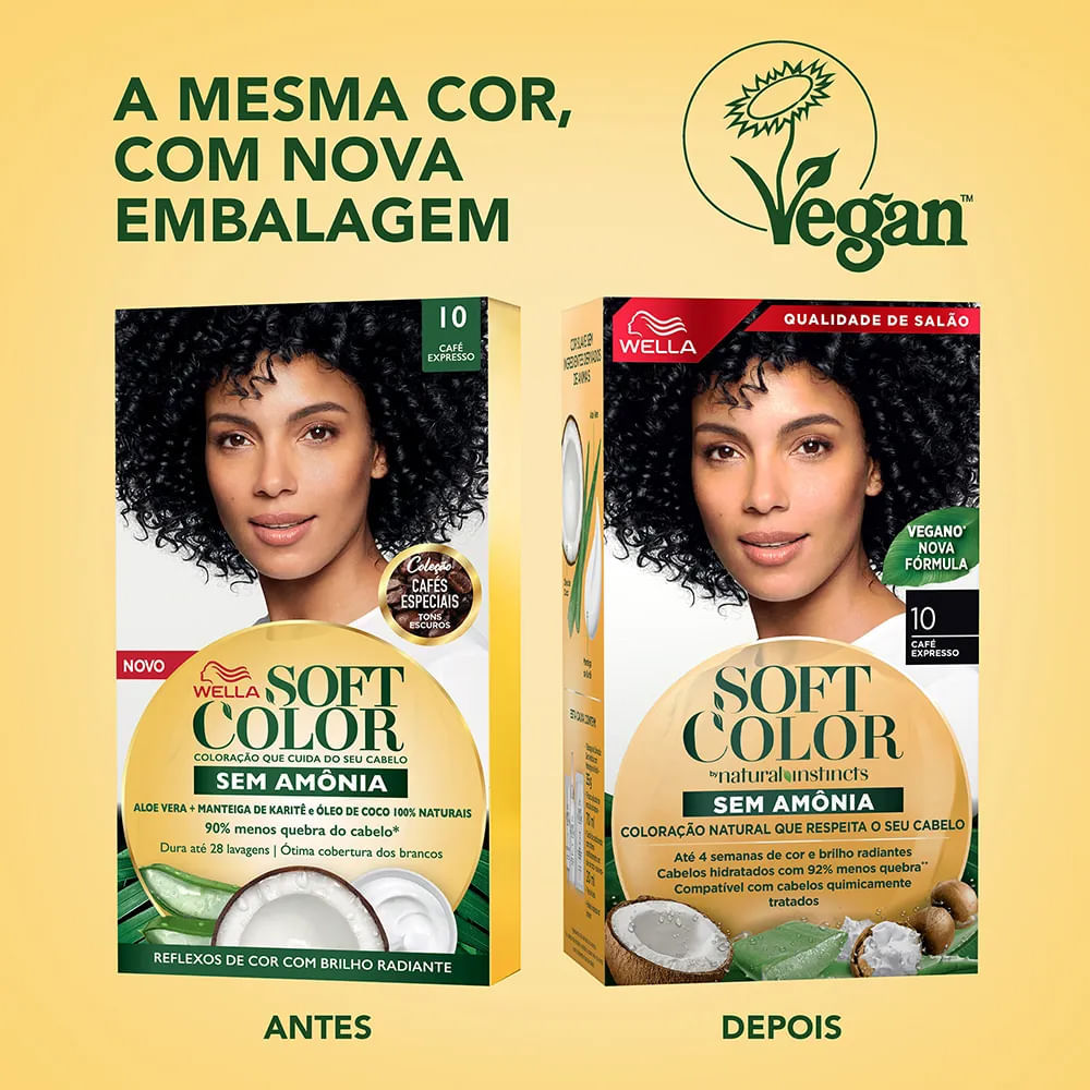 O kit Tintura Soft Color da Wella é a escolha ideal para quem busca uma coloração suave, sem amônia, com resultado natural e fios saudáveis. Sua fórmula é enriquecida com Óleo de Coco, Aloe Vera e Manteiga de Karité, promovendo hidratação, brilho e maciez durante a coloração. Proporciona cobertura uniforme, brilho radiante e neutraliza tons indesejados, como amarelado e alaranjado. Indicado para todos os tipos de cabelo, o produto garante cor vibrante por até 4 semanas e 92% menos quebra dos fios. Benefícios:• Coloração sem amônia, suave para os fios e couro cabeludo.• Até 4 semanas de cor radiante e brilho intenso.• 92% menos quebra dos fios após a coloração.• Neutraliza tons amarelados e alaranjados indesejados.• Proporciona aspecto 100% natural com cobertura uniforme.• Fórmula vegana, dermatologicamente testada e com ativos nutritivos.• Disponível em 24 tonalidades para todos os tipos de cabelo. Ativos:• Óleo de Coco – nutre, fortalece e dá brilho aos fios.• Aloe Vera – hidrata e acalma o couro cabeludo.• Manteiga de Karité – restaura a maciez e protege os cabelos do ressecamento. Modo de Uso:• Com os cabelos úmidos, misture a coloração com a emulsão ativadora do kit.• Aplique uniformemente sobre os fios, respeitando o tempo de pausa indicado na embalagem.• Enxágue completamente e aplique o condicionador de tratamento para selar a cor e garantir brilho e hidratação.• Para melhores resultados, siga rigorosamente as instruções do folheto que acompanha o produto. Sobre a marca: A Wella é referência mundial em cuidados capilares, oferecendo soluções inovadoras e profissionais há mais de 140 anos. Com a linha Soft Color, a marca reforça seu compromisso com a beleza saudável, trazendo coloração de qualidade com fórmulas veganas e sem amônia, que cuidam dos fios e realçam a beleza natural. • Realce sua beleza com a Tintura Wella Soft Color — cor radiante, sem amônia e com o cuidado que seus fios merecem!