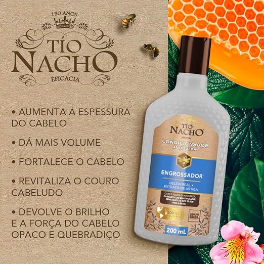 O peso líquido do conteúdo é de 415ml. Tio Nacho Engrossador Antiqueda é perfeito para fortalecer e aumentar o volume do seu cabelo, proporcionando a sensação de até 33.000 fios a mais. Tio Nacho Engrossador é indicado para cabelos opacos e quebradiços. Feito com Geleia Real e Extrato de Urtiga. Nossa tecnologia foi criada para aumentar a espessura do cabelo, fortalecer os fios, revitalizar o couro cabeludo, proporcionando ação antiqueda e revitaliza o couro cabeludo. O Engrossador Tio Nacho é perfeito para a nutrição, fortalecimento e brilho, deixando seus cabelos lindos e volumosos. Aplique o Engrossador Tio Nacho nos cabelos molhados, massageie o couro cabeludo até formar espuma, enxágue bem e repita se achar necessário.