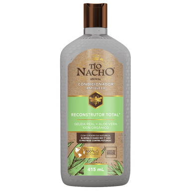 O peso líquido do conteúdo é de 415ml. Tio Nacho Reconstrutor Aloe Vera elimina os danos e protege o cabelo contra danos futuros desde o 1º uso e proporciona cabelos 10x mais fortes e resistentes. Tio Nacho Reconstrutor Aloe Vera é indicado para cabelos danificados. Feito com Geleia Real e Aloe Vera puro e 100% orgânico. Nossa tecnologia foi criada para reparação total de danos, e resistência contra danos futuros. Hidrata por 24 horas, mantém o frizz controlado e repara totalmente os fios por fora e, por dentro. Tio Nacho Reconstrutor Aloe Vera é perfeito para reparação total, hidratação profunda, fortalecimento, controle de frizz e resistência contra danos, deixando o seu cabelo 10x mais forte Aplique o Reconstrutor Aloe Vera nos cabelos molhados, massageie o couro cabeludo até formar espuma, enxágue bem e repita se achar necessário.