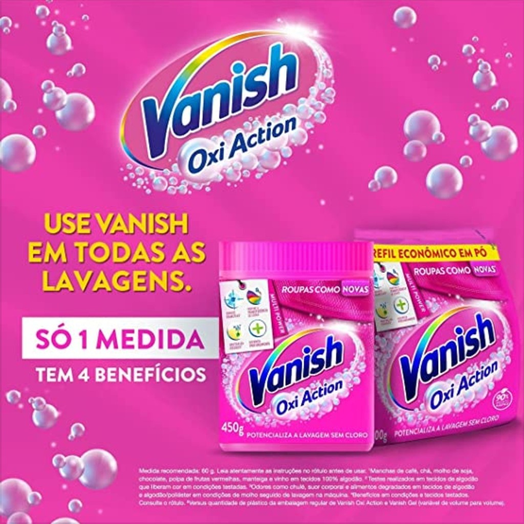 Vanish remove 100% manchas, sua poderosa frmula contm um coquetel de enzimas com poder imbatvel na remoo de manchas. At as bem pequenas que no foram vistas antes da lavagem. Vanish indicado para tecidos brancos e coloridos alm de manter as cores vivas, cuide das suas roupas usando Vanish em toda lavagem. Benefcios: Elimina manhcas Elimina odores Reala as cores 900g Modo de uso: Mquinas: 1/2 medida junto com seu detergente. Molho: Dissolva 1/2 de medida em 4l de gua a 40C. Pr-tratamento: Misture 1/4 de medida com 3/4 de medida de gua a 40c, dissolva bem e utilize a soluo imediatamente aps o preparo. Aplique diretamente na mancha e deixe agir por at 10 min. Para manchas resistentes use 1 medida. Marca: Vanish Apresentao:Tira Manchas P Vanish Multi Power Oxi Action1k refil Embalagem Econmica