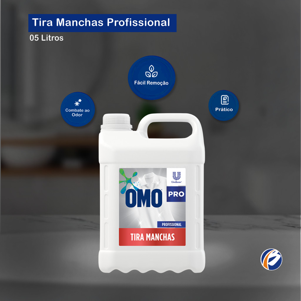Tira Manchas Profissional Líquido 5L Omo A marca líder em sabão no mercado de consumo massivo desenvolveu um Omo Tira Manchas Profissional para atender lavanderias de pequeno e grande porte. Alvejante seguro por não conter cloro em sua formulação, por isso preserva os tecidos, em comparação com produtos de base cloro, sendo versátil podendo ser utilizado direto na máquina, em aplicação direta e/ou molho, além de combater o odor impregnado. Indicação de Uso: - Lavagem de roupas brancas e coloridas Embalagem: 01 galão de 5L