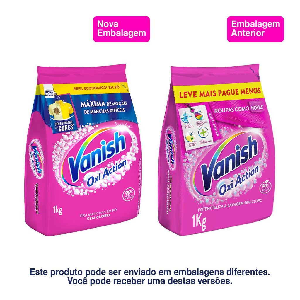 Vanish Oxi Action é o potencializador de lavagem em pó, sem cloro, que higieniza, remove asmanchas mais difíceis, neutraliza odores das roupas coloridas, sem esforço. A exclusiva fórmula de Vanish em pó com poder Oxi previne a transferência de cores entreroupas, higieniza profundamente suas roupas coloridas, deixando as cores e fibraspreservadas. Você sabe como tirar mancha de roupa colorida? Vanish Oxi Action tira manchas e prolonga a vida das roupas coloridas do dia a dia, semdanificar os tecidos. Para remover manchas difíceis e deixar o branco mais branco, adicione uma medida (60g) deVanish no molho em 4L de água a 40°C e deixe por 1 hora ou na lavagem em máquina comseu sabão/detergente de preferência. Para saber mais sobre o modo de uso confira o rótulo Diga adeus às manchas! Com Vanish Oxi Action suas roupas coloridas ganham vida nova. O Vanish Oxi Action é Multipower! Especialista em tratamento de tecidos, Vanish é o tira manchas número 1 do Brasil¹. Vanish Oxi Action remove até as manchas mais difíceis de café, chá, molho de soja, chocolate,polpa de frutas vermelhas, manteiga e vinho, entre outras, sem esfregar². É uma revolução nocuidado com as roupas! Deixe suas crianças se lambuzarem de chocolate e permita-se aventurar na cozinha sem medoda sujeira, que Vanish é seu aliado na remoção das manchas difíceis. Ele trata as manchas e os tecidos, deixando suas roupas coloridas como novas por maistempo. Não deixe faltar em casa! Vanish traz mais higiene e cuidado para sua família. Tradição e Eficiência Vanish está presente no Brasil há mais de 20 anos. É uma marca que se utiliza de altatecnologia para desenvolver produtos cada vez mais eficientes para seus consumidores. Oresultado são roupas sem manchas, com os tecidos protegidos e como novas por mais tempo. E para ter roupas brancas mais brancas experimente Vanish Oxi Action Crystal White, e pararoupas coloridas livres de odores e de germes e bactérias² use Vanish Oxi Advance. ¹Fonte: Nielsen IQ, Retail Index. Dados do período DEZ´ 21 ATÉ NOV ´ 22 (MAT ´ 22). Abrangênciageográfica Total Brasil. Mercado PC 15: ÁGUA SANITÁRIA E ALVEJANTES. Canais reportados: INA +C&C. ²Benefícios do produto em condições testadas. Leia atentamente o rótulo antes de usar o produto.