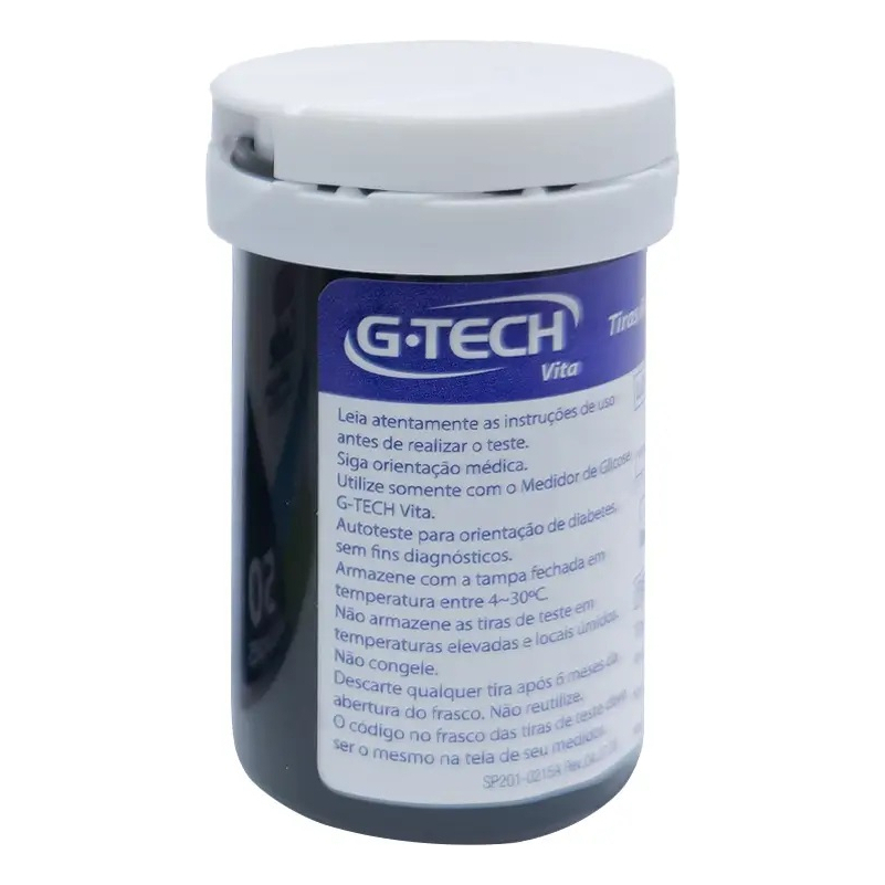 TIRAS REAGENTES G-TECH VITA 50 UNI As Tiras reagentes G-Tech Vita são produzidas com a moderna enzima Glicose Desidrogenase (FAD-GDH), garantindo resultados confiáveis em microamostras de sangue capilar ou venoso total, sendo uma excelente ferramenta tanto para uso em casa quanto em ambientes hospitalares. Além das tradicionais embalagens de 25 ou 50 tiras, as Tiras Reagentes G-Tech Vita contam com a nova apresentação de 50 tiras embaladas individualmente. Com o exclusivo sistema AutoCode, cada tira possui um código interno que é automaticamente reconhecido e ajustado pelo aparelho, evitando resultados incorretos pela codificação manual do usuário e tornando a medição muito mais segura e rápida. As Tiras reagentes G-Tech Vita são para uso EXCLUSIVO no medidor de glicose G-Tech Vita. -Sistema AutoCode: o aparelho reconhece automaticamente a codificação das tiras. -Pode ser utilizada com sangue capilar, arterial, venoso e neonatal. -Disponível nas versões com 25 e 50 tiras. -Exclusiva versão com 50 tiras embaladas individualmente. -Em conformidade com a norma ISO 15197/2013.