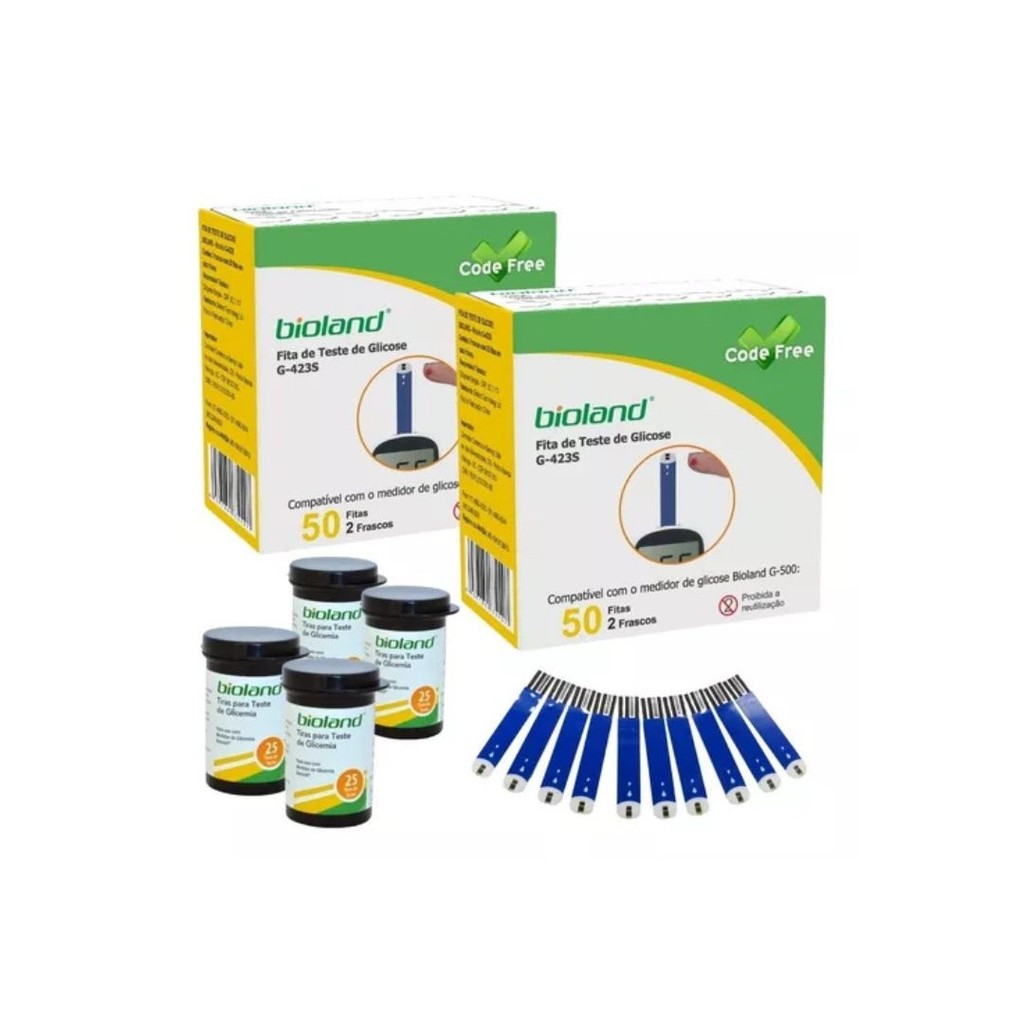 Tiras Para Medição de Glicose G-423S Bioland - 100 Unidades - Caixa com 50 fitas (dois potes com 25); - Diagnóstico in vitro; - Para uso exclusivo nos aparelhos de glicemia da marca Bioland: G-425-3, G500.