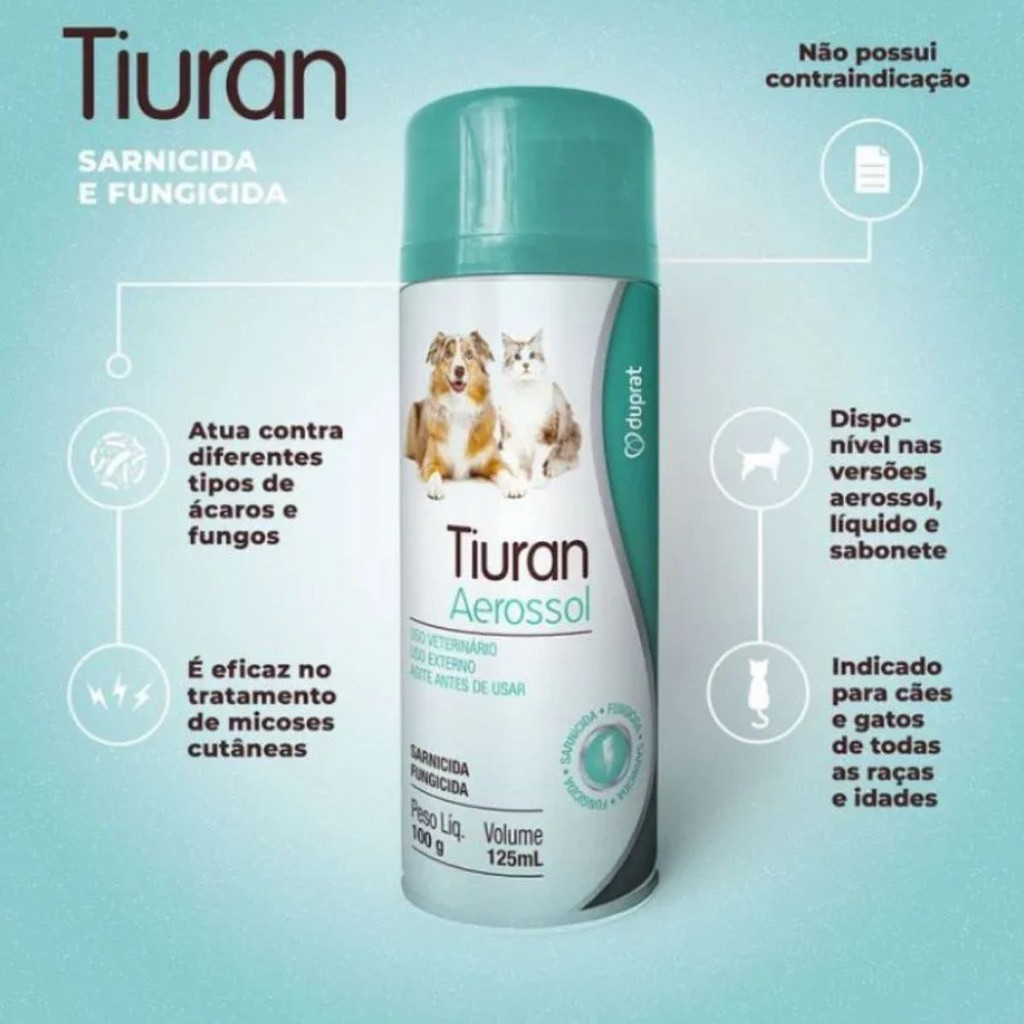 Descubra a eficácia do Tiuran Spray, um produto veterinário de alta qualidade da Duprat, projetado para combater diversos tipos de sarna em cães e gatos. Este spray aerossol é a solução ideal para tratar sarnas sarcópticas, cnemidocópticas, psorópticas, coriópticas, notoédricas e otodéticas, além de auxiliar na cicatrização e crescimento dos pelos afetados. Composição: Cada 100ml do Tiuran Spray contém 3g de Monossulfureto de Tetraetiltiuran, garantindo uma fórmula poderosa e eficaz. Modo de Uso: 1. Inicie com um banho para o animal usando o Sabonete Tiuran e água morna, removendo crostas e sujeiras. 2. Agite bem o spray e aplique nas áreas afetadas, mantendo uma distância de cerca de 15cm. 3. Utilize uma vez ao dia até que as lesões sejam completamente eliminadas. Em geral, a melhora é visível em 2 a 3 dias, mas o tratamento pode ser prolongado conforme orientação do veterinário. Cuidados de Armazenamento: - Mantenha o produto em local fresco e protegido do sol. - Evite contato com crianças e animais de estimação. - Não armazene junto com alimentos, bebidas ou produtos de higiene. Aplique o Tiuran Spray com confiança e veja a diferença no bem-estar do seu pet!